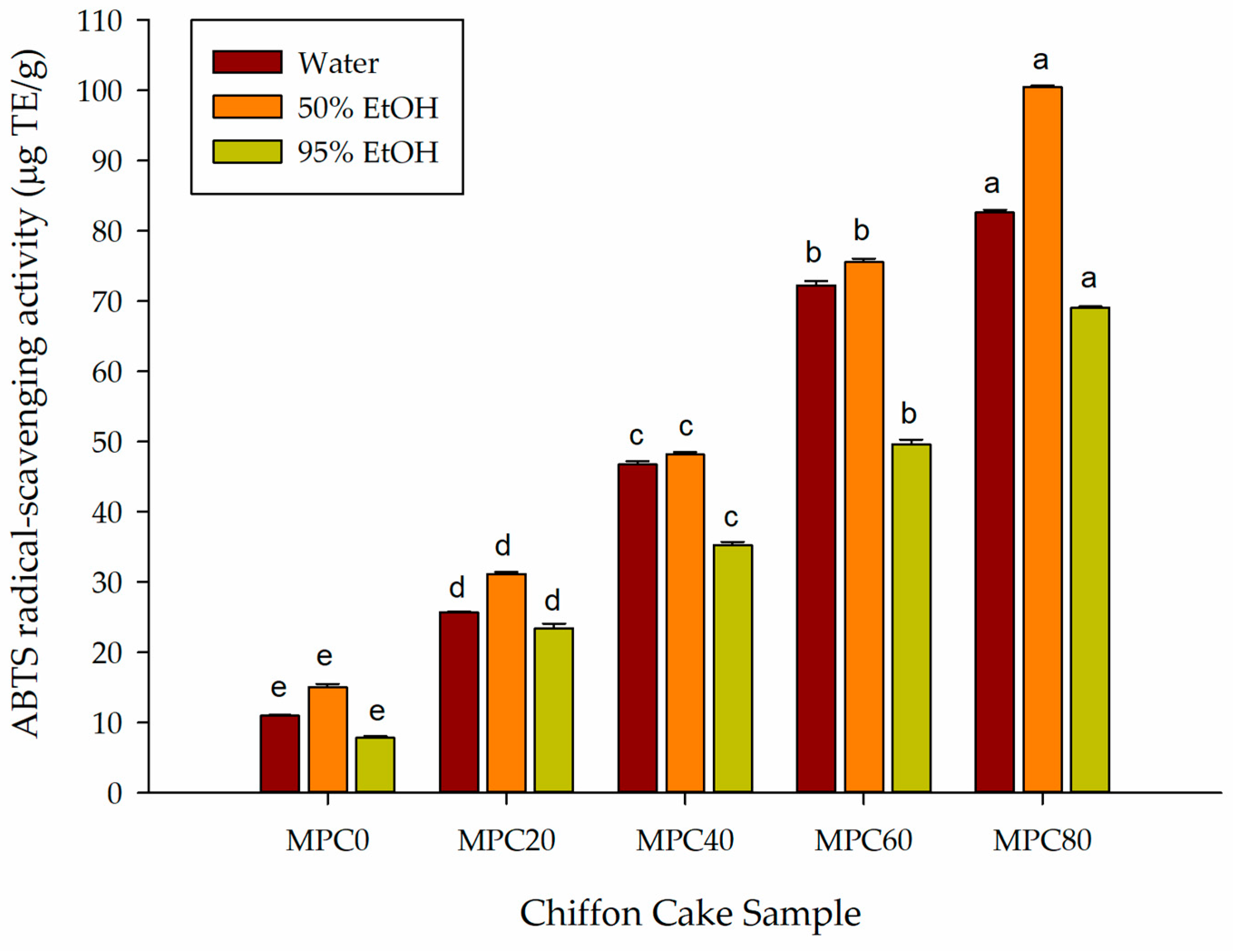 In chiffon cake formulations, ABTS radical-scavenging activity increased substantially with higher MPP substitution. Water extracts rose from 10.98 μg TE/g in MPC0 to 82.59 μg TE/g in MPC80 (approximately 7.5-fold). Under 50% ethanol, the values increased from 15.01 to 100.46 μg TE/g (approximately 6.7-fold), while 95% ethanol extracts increased from 7.81 to 69.05 μg TE/g (approximately 9-fold). The strongest activity in MPC80 was obtained with 50% ethanol, demonstrating that moderately polar constituents from MPP are most efficiently extracted under intermediate-polarity conditions.
