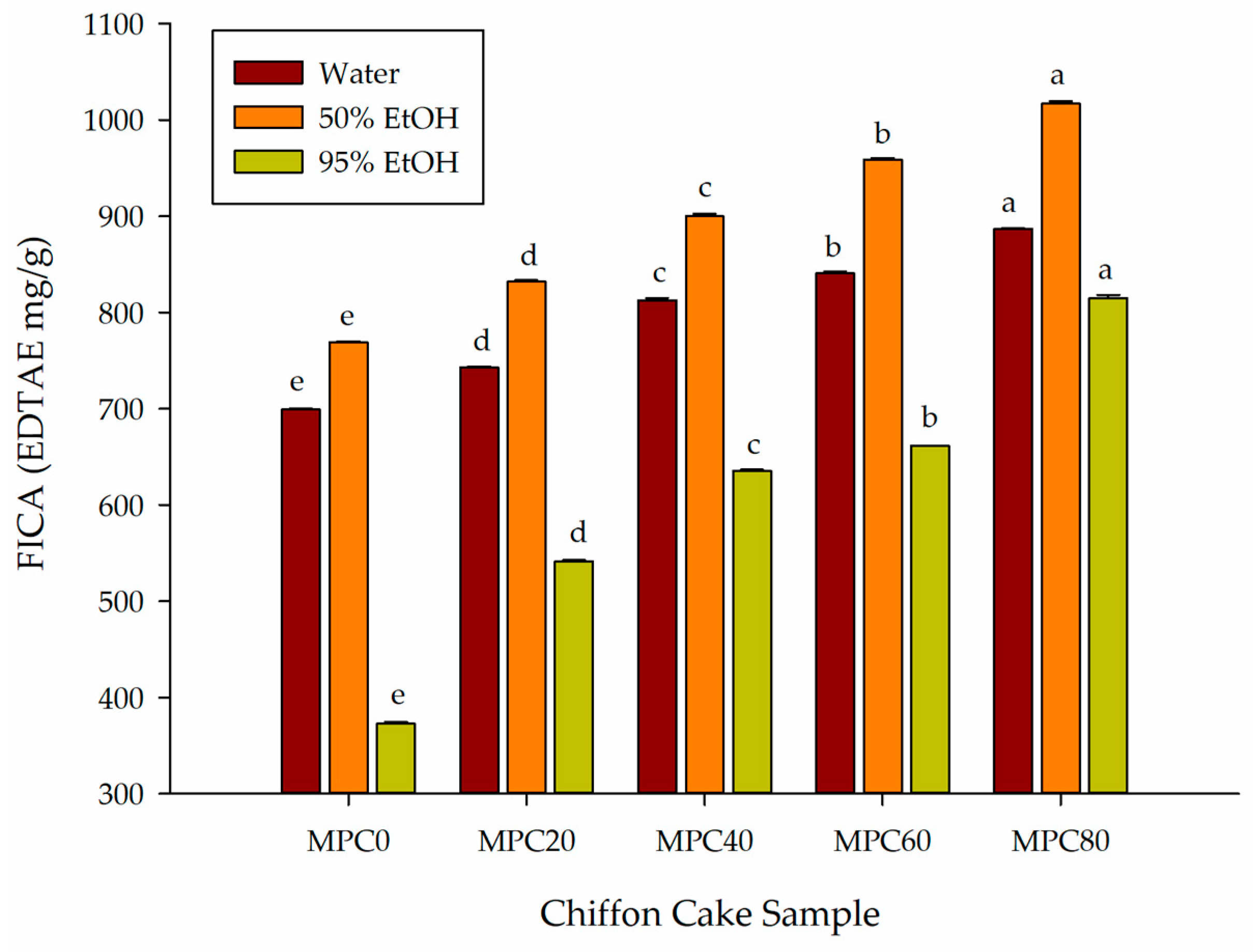 p < 0.05). In water extracts, FICA values increased from 699 μg EDTAE/g in MPC0 to 886 μg EDTAE/g in MPC80. In 50% ethanol extracts, values rose from 769 to 1017 μg EDTAE/g, while 95% ethanol extracts increased from 373 to 815 μg EDTAE/g. Among all treatments, the MPC80 sample extracted with 50% ethanol exhibited the highest chelating activity, indicating that moderately polar constituents of MPP contributed most effectively to Fe