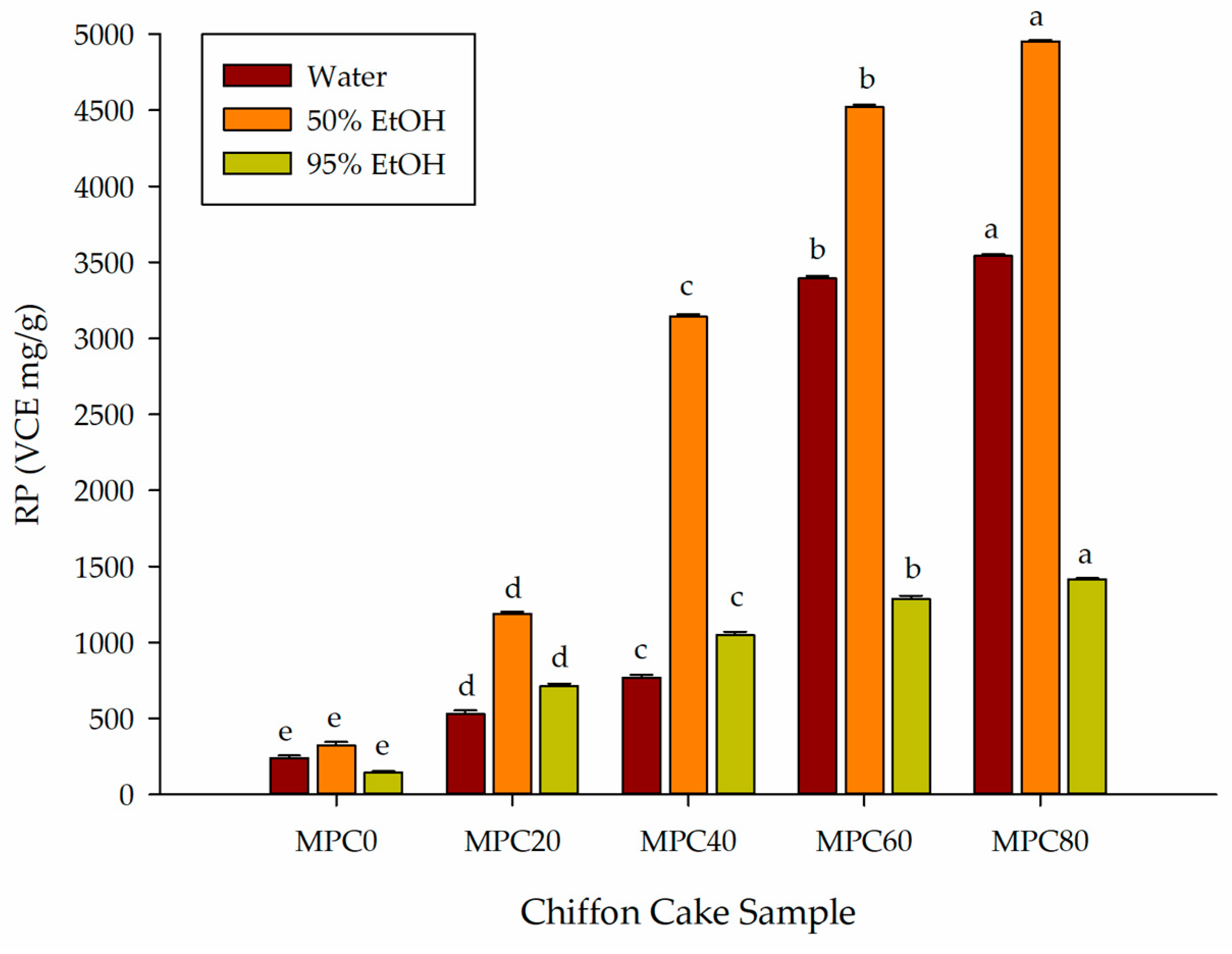 Figure 5, the RP of chiffon cake extracts increased markedly with higher levels of MPP substitution across all solvent systems (