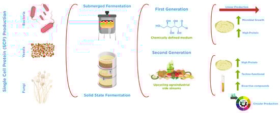 Microorganisms have several advantages, including their metabolic versatility and capacity to address pressing challenges, such as providing scalable protein at low cost and with minimal environmental impact through microbial protein production. There is growing interest in the use of microbial protein, also known as single-cell protein (SCP), bioprotein, or biomass, to meet the global demand for nutritious food, as it has various advantages over conventional plant sources. These benefits include nutritional composition, circular processes, short production times (minutes to hours) with no extensive land use. SCP is an edible unicellular microorganism derived from several species of microorganisms, primarily fungi, microalgae, yeasts, or bacteria [114]. These groups of microorganisms show distinct nutritional compositions on a dry weight basis. Fungi contain 30–45% protein, 2–8% fat, 9–14% ash, and 7–10% nucleic acids, while macroalgae are richer in protein (40–60%) and fat (7–20%), with 8–10% ash and a lower nucleic acid content (3–8%). Yeasts provide 45–55% protein, 2–6% fat, 5–10% ash, and 6–12% nucleic acids, representing a balanced nutrient profile. Bacteria stand out as the richest in protein (50–65%) but have very low fat (1–3%), 3–7% ash, and relatively high nucleic acid levels (8–12%) [115,116]. In general, SCP has a complete amino acid profile, including lysine, methionine, and threonine, which satisfies nutritional requirements. However, it can be deficient in sulfur-containing amino acids such as methionine and cysteine [117]. Whereas high levels of minerals, enzymes, and vitamins from group B (e.g., riboflavin, thiamine, pyridoxine, cobalamin, among others) have been observed [118]. In addition to their nutritional value, SCP has an important presence of biologically active compounds that confer several biofunctional properties. For instance, algae SCP contains a range of peptides associated with antioxidant, anti-proliferative, anti-inflammatory, antihypertensive, anti-diabetic, and antimicrobial properties [119]. Furthermore, fungal proteins exhibit a range of functional properties, including regulating lipid and cholesterol levels, increasing satiety, promoting digestion, improving immunity, and facilitating intestinal health [120]. Therefore, this remarkable complexity makes SCP highly versatile for a wide range of applications, from food to feed production. However, the main concern in SCP is the presence of a high concentration of nucleic acids derived from DNA and RNA of microbial cells, mainly derived from RNA due to rapid microbial growth. After consumption, purines from nucleic acids are metabolized into uric acid, whose accumulation in the serum is associated with the formation of kidney stones and gout [121]. Among the methods to minimize nucleic acid content of SCP, heat treatment (i.e., at 60–75 °C for several minutes) can be applied to activate endogenous RNases to break down ribonucleotides that diffuse out of the cells and are subsequently removed by centrifugation or filtration, minimizing the loss of protein quantity and quality [122,123]. Other types of compounds that may develop during microbial growth, such as mycotoxins and cyanotoxins [124], represent significant health concerns. Therefore, the careful selection of microorganisms and the conditions for biomass production are crucial when initiating an SCP production process, as they must meet specific quality criteria. These include high nutritional value (adequate protein content and bioavailability), safety (absence of toxins and low nucleic acid content), consumer acceptance (desirable taste, flavor, and texture), and cost-effectiveness in production [125].
