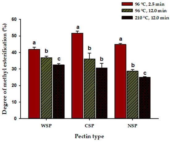 The DM of pectins from blanched peppers ranged between 41.9% and 51.6% (Figure 1). These DM values were within the range reported generally for pectin from other chilies (DM = 40–67%) and other pectin sources, such as citrus (DM = 37.2–65.8%) and apples (DM = 22.8–67.4%) [13,23,39,58,59]. Overall, the extracted pectins are classified as low-methoxyl pectin, as only CSP from blanched peppers showed a DM slightly above 50%. However, the difference in DM for the three pectin types from blanched peppers was small (Figure 1). Recently, Bao et al. [15] also found that the pectin from Xiaomila chili peppers was, in general, of low DM and observed that CSP and WSP had higher DM than NSP, with this being attributed to the de-esterification of NSP during the extraction process. CSP from untreated citrus pulp also had higher DM than WSP and NSP [39]. CSP from bilberry also showed a higher DM (77%) than other pectin types [60]. Yoshioka et al. [61] demonstrated that polyuronides of high DM were commonly found in CSP. CSP from blanched BPs could be used, for example, to form gels in the presence of sugars and acids, according to its DM [14]. On the other hand, WSP and NSP (low DM) from blanched BPs could be used as a functional ingredient in restructured fish products due to their texturizing properties without significantly affecting the food color [62].