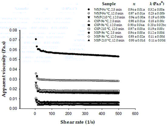 The consistency index (k), which is an indicator of viscosity for power-law fluids [14], ranged from 0.12 Pa.sn to 0.32 Pa.sn for pectin from blanched BPs (Figure 2). These k values were similar to those reported (0.15–0.39 Pa.sn) for solutions of the same pectin types from apples and green and red pungent peppers [7,84] but slightly lower than those of the same pectin types from citrus fruits [39]. Our k values yielded apparent viscosities at shear rates below 1/s that were more than 100 times higher than that of water (0.001 Pa·sn). Our k values were also similar to those (0.1–0.26 Pa·sn) recently reported for apple pectin solutions (pH 5) containing a higher pectin concentration than that used in our study [81]. Thus, potential functional properties can be inferred for the tested pectins. WSP showed the highest k values as compared to CSP and NSP. Similar results were observed for these pectin types from okra [72]. In our study, the k of WSP solutions decreased (28–41%) with the intensity of heat treatment. The impact of heat treatment on k values was not observed clearly for CSP and NSP. Ramos-Aguilar et al. [7] also observed that the heat treatment of green and red pungent peppers caused higher decreases in k in solutions of WSP as the intensity of the heat treatment increased, while this effect was not observed clearly for solutions of CSP and NSP. k values did not relate well to MW and DM of pectins, as observed for pectins from other sources [14,16,72]. This is expected as the viscosity of pectin solutions depends on many factors, including the pectin source, molecular weight, aggregation degree, conformation of molecules, degree of esterification, pH, and temperature [14].