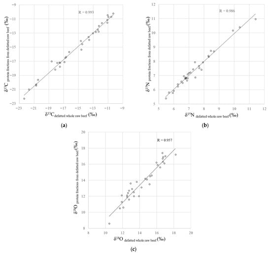 Relationship between the (a) δ13C, (b) δ15N and (c) δ18O values of defatted whole raw beef samples and the protein fractions obtained from defatted raw beef samples.