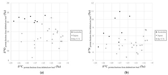 (a)The δ13C and δ18O values, and (b) the δ13C and δ15N values of the protein fractions obtained from defatted beef samples from Japan, the U.S., and Australia.