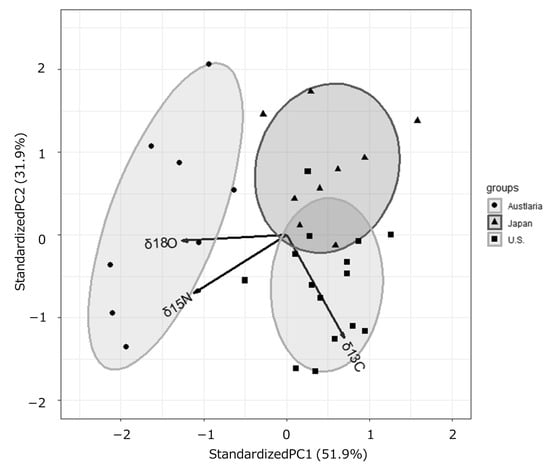 The PC1 in PCA is primarily influenced by oxygen isotope ratios. The oxygen isotope ratio of beef primarily reflects that of drinking water. Water oxygen isotope ratios have been reported worldwide. For example, Katsuyama et al. 2015 reported an oxygen isotope ratio map for Japan, showing values ranging from −13 to −6‰ [20]. Gabriel J. Bowen et al. reported a map of oxygen isotope ratios in tap water across the U.S. This map showed a wide range of values (−18 to −1‰) in beef-producing states, including Nebraska, Texas, Kansas, Iowa, and Colorado [21]. McInerney et al. 2023, presented a map of oxygen isotope ratios in Australian rainwater [22]. The primary beef cattle production regions of New South Wales, Queensland, and Victoria showed values ranging from −9 to −4‰. Notably, Australian beef imported by Japan originates from New South Wales, exhibiting relatively high values of −6 to −4‰. A comparison of literature values shows that the oxygen isotope ratios of water in the production areas of Australian beef exported to Japan are higher than those in beef production areas in Japan and the U.S. Therefore, the oxygen isotope ratios of water in each country are reflected in the oxygen isotope ratios of beef and it is considered that each country will exhibit characteristic values.