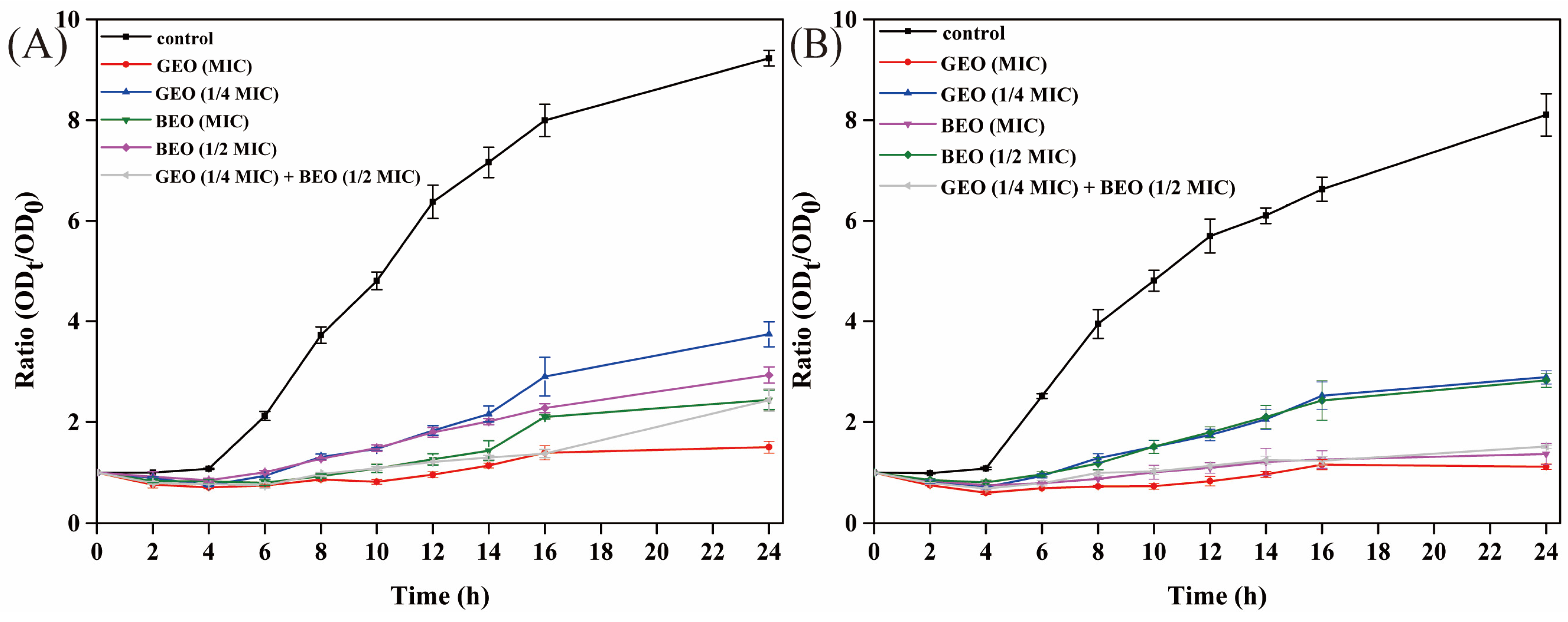 2.2.3. Time-Killing Analysis of BEO and GEO