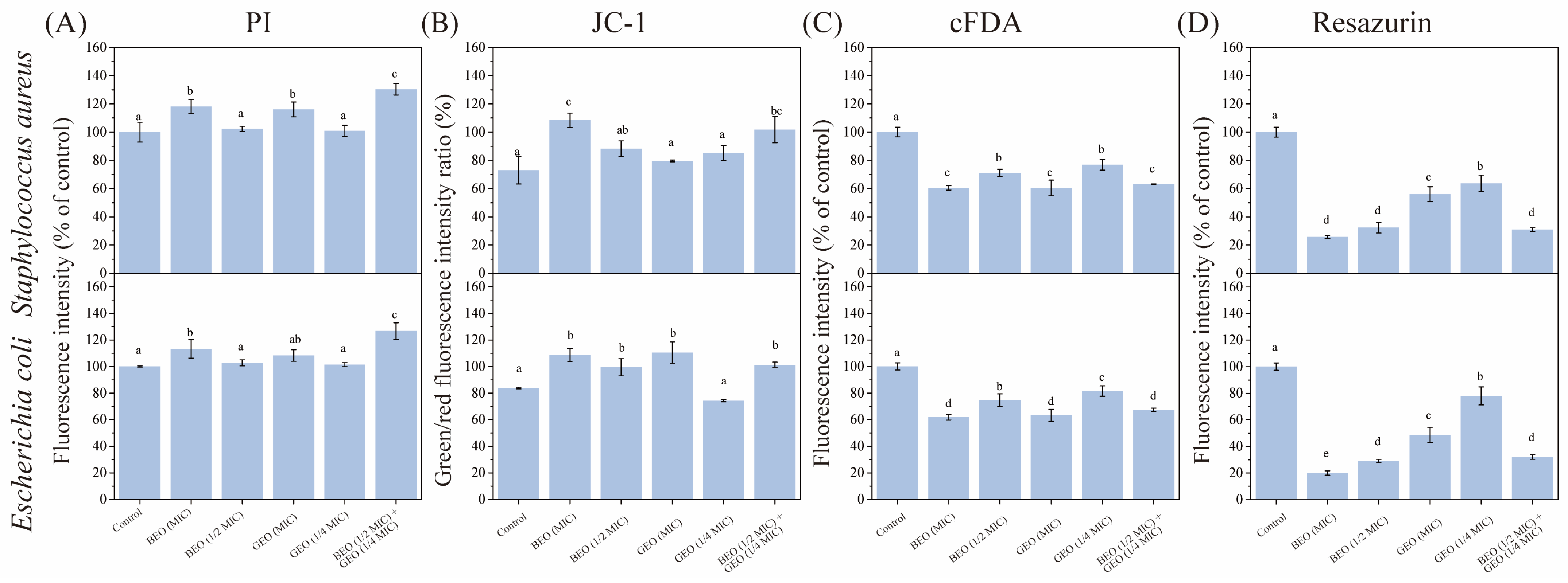 3.2.2. Effects of BEO and GEO on Intracellular Enzyme Activity