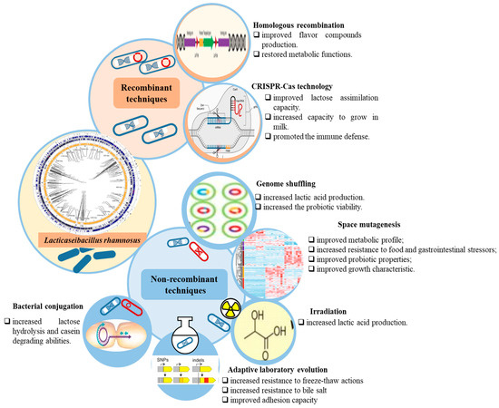 Figure 1. Genetic engineering techniques to enhance L. rhamnosus metabolic functionalities along with their associated achievements.