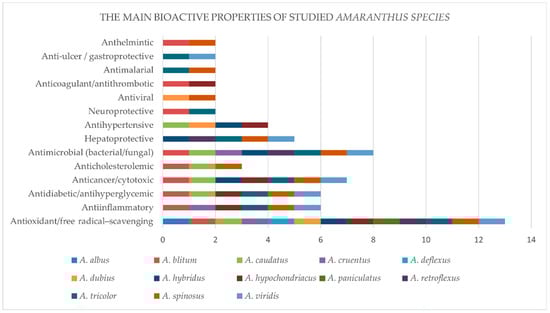 Accumulated literature data indicate the established bioactive properties of the investigated Amaranthus species, including antioxidant, anti-inflammatory, antimicrobial, and hepatoprotective activities, primarily associated with the presence of phenolic compounds, flavonoids, betalains, saponins, sterols, peptides and others (Table 2, Figure 3).