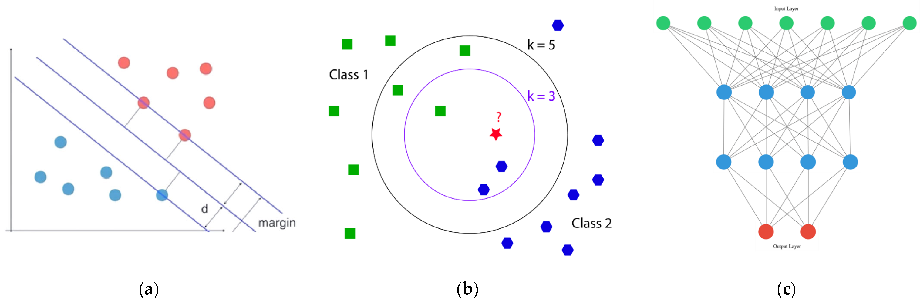 - k-Nearest Neighbors. KNN performs classification by measuring distances between different feature values. Its core principle involves simply providing a target prediction, then calculating distances or similarities between this prediction and all samples, followed by voting on the decision using these distances or similarities. Consequently, the KNN classifier heavily relies on the K nearest values, where the parameter K significantly impacts the model’s recognition accuracy and thus requires optimization for further analysis [39]. The KNN algorithm offers advantages such as simplicity and high accuracy, making it widely applied in food variety classification, quality assessment of aquatic products and meat products, and pesticide residue detection in leafy vegetables. Furthermore, KNN serves not only as an effective classifier but also finds utility in hyperspectral imaging detection. Additionally, integrating KNN with E-nose data and machine vision images through decision layer fusion achieves higher accuracy in tea grade classification.