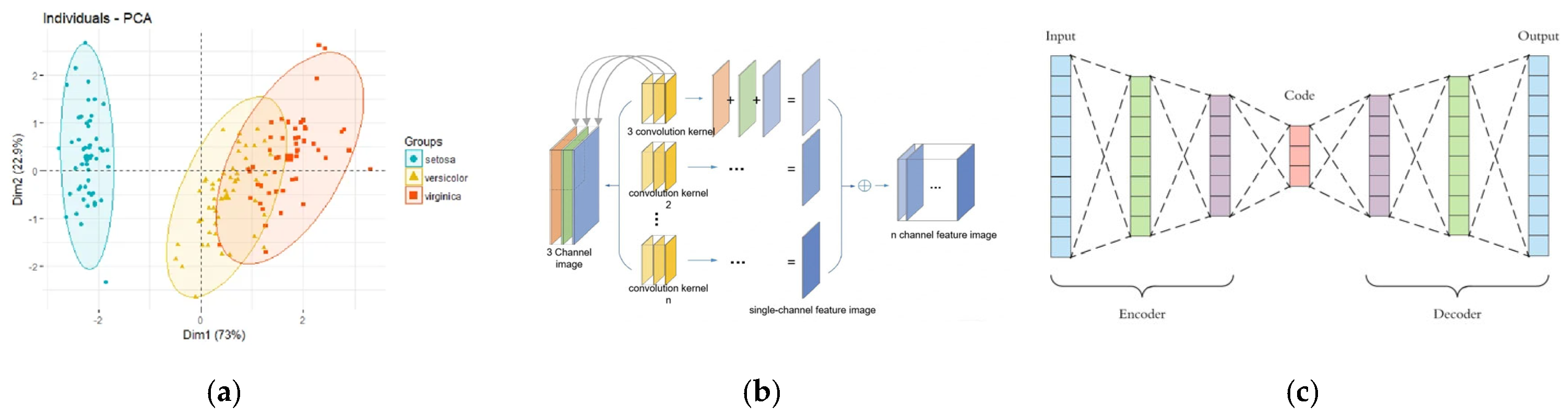 - Autoencoders. Autoencoders (AEs) are unsupervised neural networks trained via backpropagation. As powerful feature extraction tools, they map raw input data into feature vectors and reconstruct the original input using these vectors [53]. AEs receive raw inputs, with the encoder compressing representations that are subsequently decoded to reconstruct inputs. In deep AEs, lower hidden layers encode data while higher layers decode it, with error backpropagation driving training [30]. Due to their representational power, AEs can be stacked and layered to form deep learning networks. Several variants exist, including denoising AEs, sparse AEs, variational AEs, and contracting AEs [54]. These are invariably applied to high-dimensional data, with dimensionality reduction interpreted as PCA for a dataset. However, AEs offer greater flexibility than PCA. Furthermore, AEs permit both linear and nonlinear representations during dataset encoding, whereas only linear transformations are feasible in PCA [55]. In non-destructive testing techniques, AEs have been employed for feature extraction to enhance the predictive accuracy of calibration models. Ni et al. [56] developed a variably weighted stacked autoencoder to extract discriminative features from hyperspectral images (HSIs), which was applied to the online sorting of cotton films. In a similar vein, research has shown that when deep autoencoders are employed as a feature extraction tool in conjunction with HSIs, their performance in determining the chemical composition of dried black goji berries is comparable to, or even outperforms, that of PCA [55]. Furthermore, Huang et al. [57] proposed a computer vision system for estimating soluble solids content (SSCs) in Fuji apples at different maturity stages. This system employs stacked autoencoders to extract color features at the pixel level. Results indicate that the Stacked autoencoder (SAE)-based back propagation neural network (BPNN) model utilizing pixel-level color features achieves higher recognition rates at the feature level compared to BPNN models based solely on pure color features.