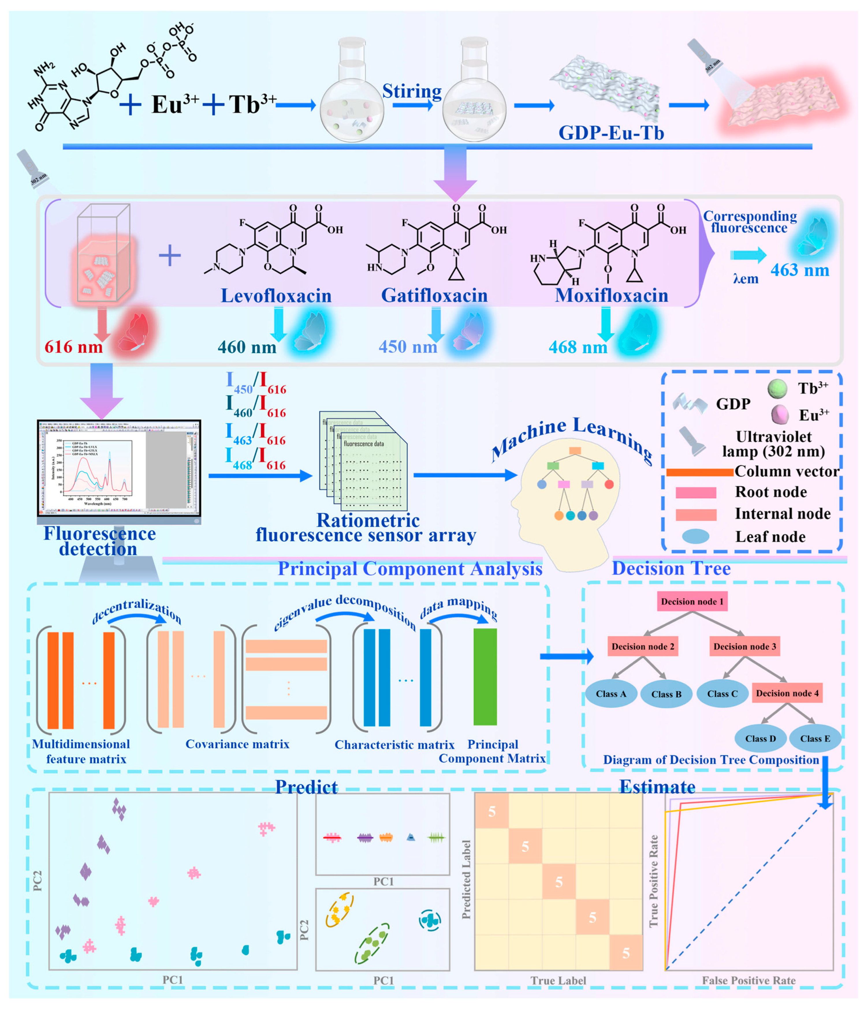 - Li, M.; Jia, L.; Zhao, X.; Zhang, L.; Zhao, D.; Xu, J.; Zhao, T. Machine learning-assisted ratiometric fluorescence sensor array for recognition of multiple quinolones antibiotics. Food Chem. 2025, 478, 143722. [Google Scholar] [CrossRef]