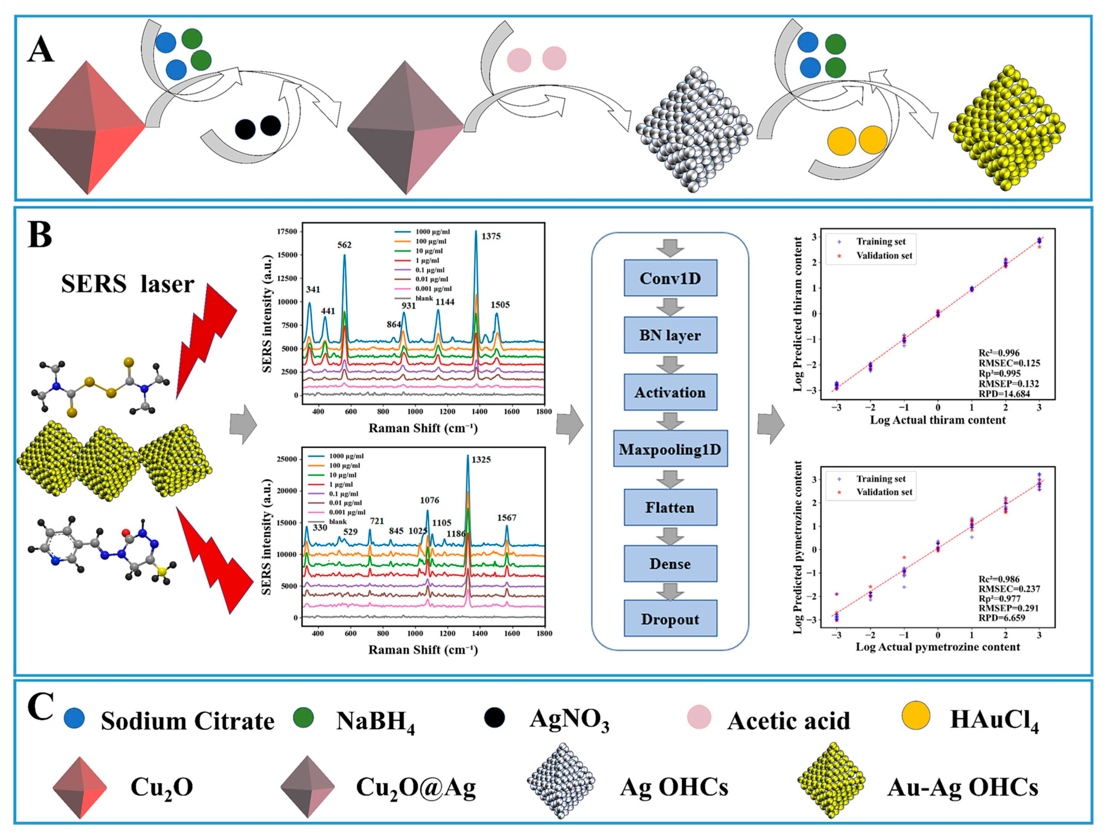 - Li, H.; Luo, X.; Haruna, S.A.; Zareef, M.; Chen, Q.; Ding, Z.; Yan, Y. Au-Ag OHCs-based SERS sensor coupled with deep learning CNN algorithm to quantify thiram and pymetrozine in tea. Food Chem. 2023, 428, 136798. [Google Scholar] [CrossRef]