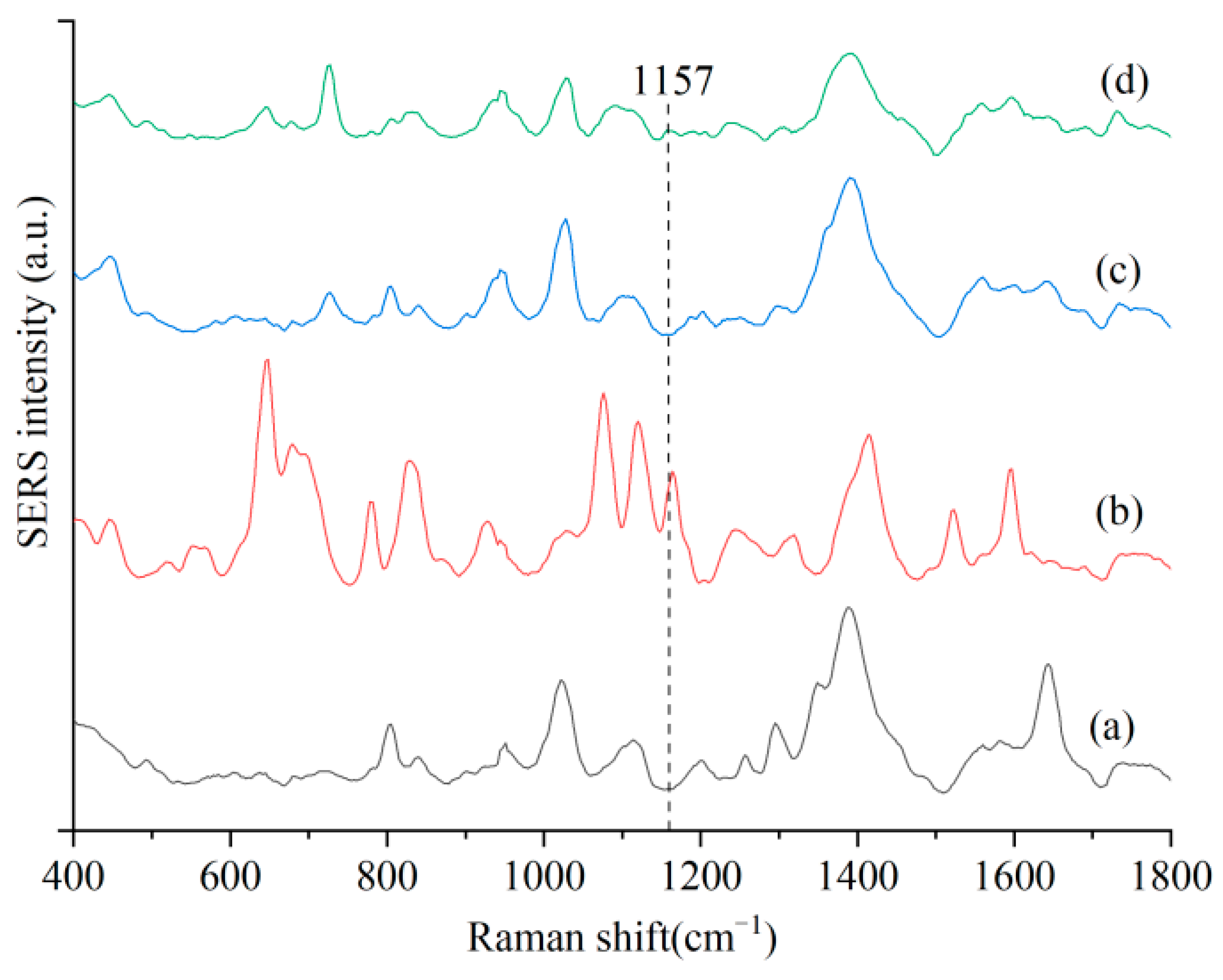 To investigate the influence of different colloidal substrates on the SERS intensity of sulfathiazole in chicken blood, 550 μL different kinds of colloidal solutions (gold colloid A, gold colloid B, gold colloid C, and silver colloid) were introduced into quartz vials, followed by the addition of 20 μL chicken blood extract containing sulfathiazole and 60 μL NaCl solution (0.1 mol/L) and mixed evenly. Their SERS spectra were measured after adsorption for 0 min. Five parallel samples were set under each colloidal solution condition, and their average spectra was taken as the SERS spectra of the sample under this condition. By comparing the SERS intensities at 1157 cm−1, the optimal colloidal species were determined for the detection of sulfathiazole in chicken blood samples.
