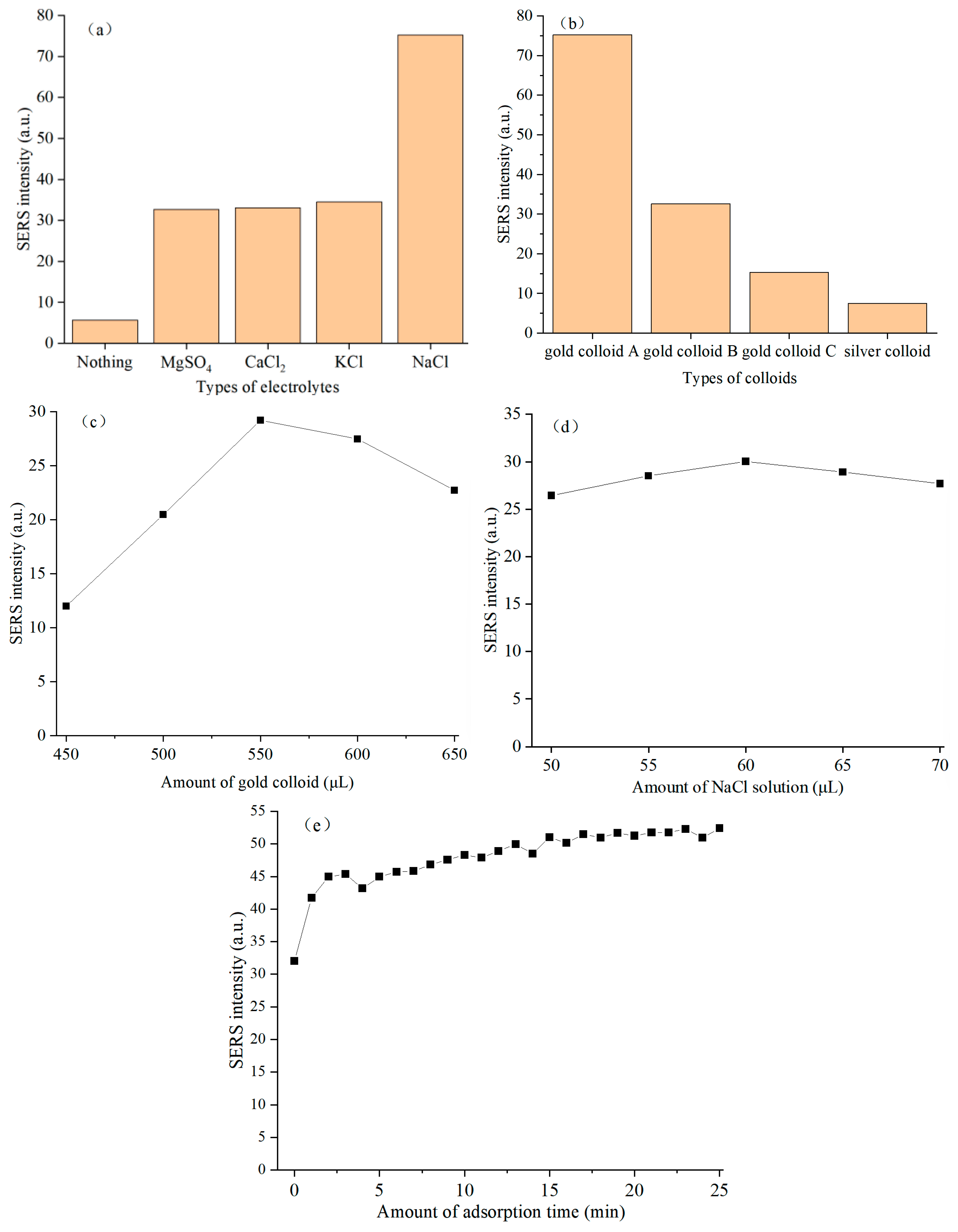 To examine the effect of different electrolytes on the SERS intensity of sulfathiazole in chicken blood, 550 μL gold colloid, 20 μL chicken blood extract containing sulfathiazole and 60 μL different kinds of electrolyte solutions (0.1 mol/L CaCl2 solution, 0.1 mol/L MgSO4 solution, 0.1 mol/L KCl solution, 0.1 mol/L NaCl solution and equal volume of ultrapure water) were added to the quartz bottle and mixed evenly. Their SERS spectra were measured after adsorption for 0 min. Five parallel samples were set under each electrolyte solution condition, and their average spectra was taken as the SERS spectra of the sample under this condition. Their SERS intensities at 1157 cm−1 were used to determine the optimal electrolyte species for detecting sulfathiazole in chicken blood sample.