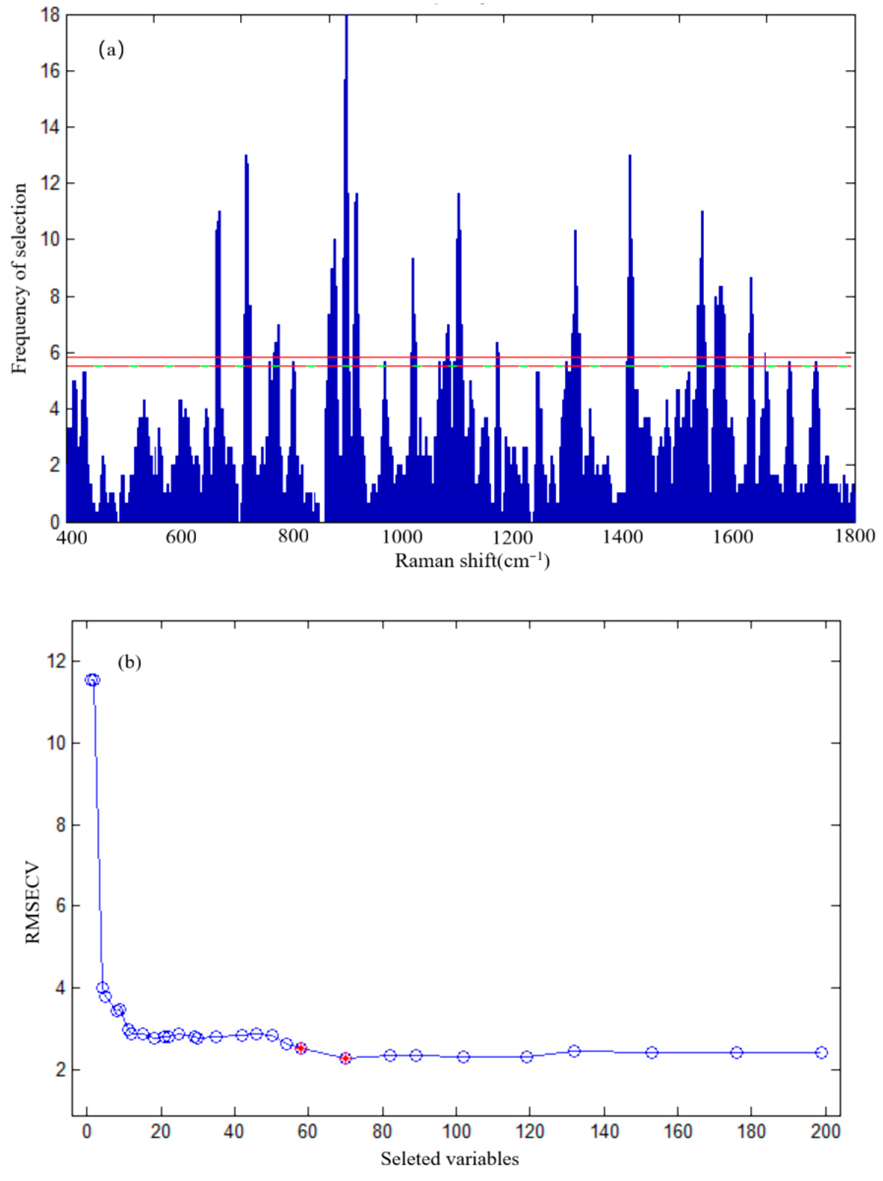 The SERS characteristic wavelengths of sulfathiazole in chicken blood were screened by Matlab GA-PLS toolkit. The relevant parameters of GA were set as follows: the initial population of 30, the mutation probability of 0.01, and the crossover probability of 0.5. The fitness function of GA was constructed by RMSECV value, and the iteration was terminated when the iteration is 100 times.
