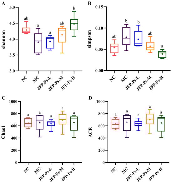 Effects of JFP-Ps on α-diversity of gut microbiota in Cy-induced immunosuppressed mice. (A) Shannon index, (B) Simpson index, (C) Chao1 index, (D) ACE index. The results of α-diversity showed that high-dose JFP-Ps treatment significantly increased microbial community diversity with good microbial community richness. Significant differences were denoted by distinct letters based on Duncan’s multiple range test at a significance level of p < 0.05.