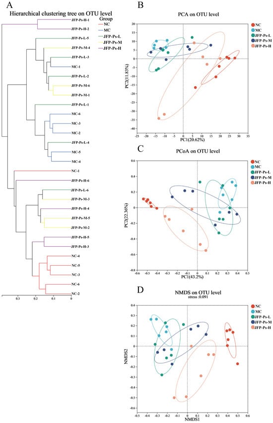 α-Diversity analysis at the OTU level was performed to assess microbial community richness and diversity. The species richness of the gut microbiota was mainly reflected by the Chao1 and ACE indices, while microbial diversity was primarily reflected by the Simpson and Shannon indices. As presented in Figure 1, the α-diversity indices (Shannon and Simpson) remained comparable across the NC, MC, JFP-Ps-L, and JFP-Ps-M groups, indicating no statistically significant differences in microbial community diversity. In comparison to the MC group, the Shannon index of the JFP-Ps-H group exhibited a considerable rise (p < 0.05); however, the Simpson index demonstrated a significant drop (p < 0.05), indicating that high-dose JFP-Ps treatment significantly increased microbial community diversity. Chao and ACE indices reflected microbial community richness; Figure 1C,D show no differences among the groups, indicating good microbial community richness in all samples.