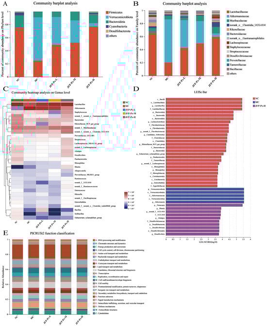 Effects of JFP-Ps on the composition of gut microbiota in Cy-induced immunosuppressed mice. Microbial community composition at the phylum level (A) and family level (B);heatmap showing the relative abundance of key genera (C); histogram of LDA effect values for biomarker species, LDA > 2 (D); prediction of PICRUSt2 function in the microbiome (E). The key species types of microbiota in the feces of Cy-induced immunosuppressed mice were altered by JFP-Ps.