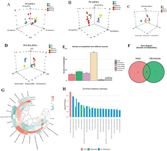 Effects of JFP-Ps on the fecal metabolic profile in Cy-induced immunosuppressive mice. PCA plots of metabolites among NC, MC, JFP-Ps-L, JFP-Ps-M, and JFP-Ps-H groups in the (A) positive and (B) negative ion models. PLD-DA plots of metabolites among NC, MC, JFP-Ps-L, JFP-Ps-M, and JFP-Ps-H groups in the (C) positive and (D) negative ion models. Bar graphs (E) and Venn diagrams (F) of the number of metabolites in different classes based on MetOrigin analysis and MPEA analysis. Biomarker heatmap (G) and bar plot (H) of the number of enriched metabolic pathways from origin-based MPEA analysis.