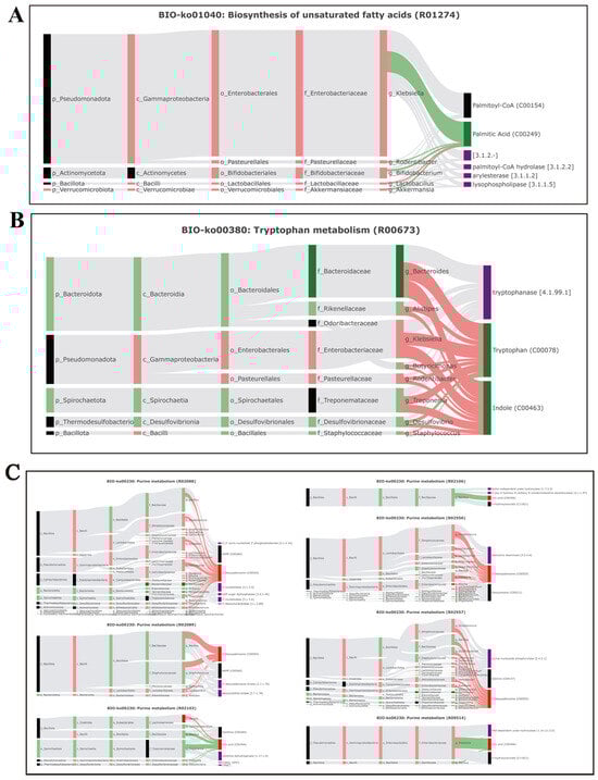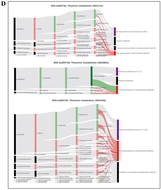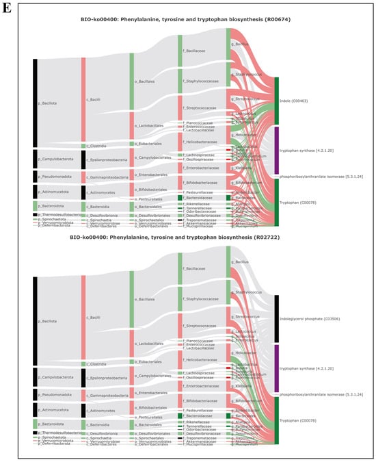 Microbiota-specific metabolic pathways, BIO-Sankey network diagrams, and network summary analysis revealed close associations between microbiota and metabolites. (A) Biosynthesis of unsaturated fatty acids (BIO-KO01040); (B) tryptophan metabolism (BIO-KO00380); (C) purine metabolism (BIO-KO00230); (D) thiamine metabolism (BIO-KO00730); (E) phenylalanine, tyrosine, and tryptophan metabolism (BIO-KO00400).