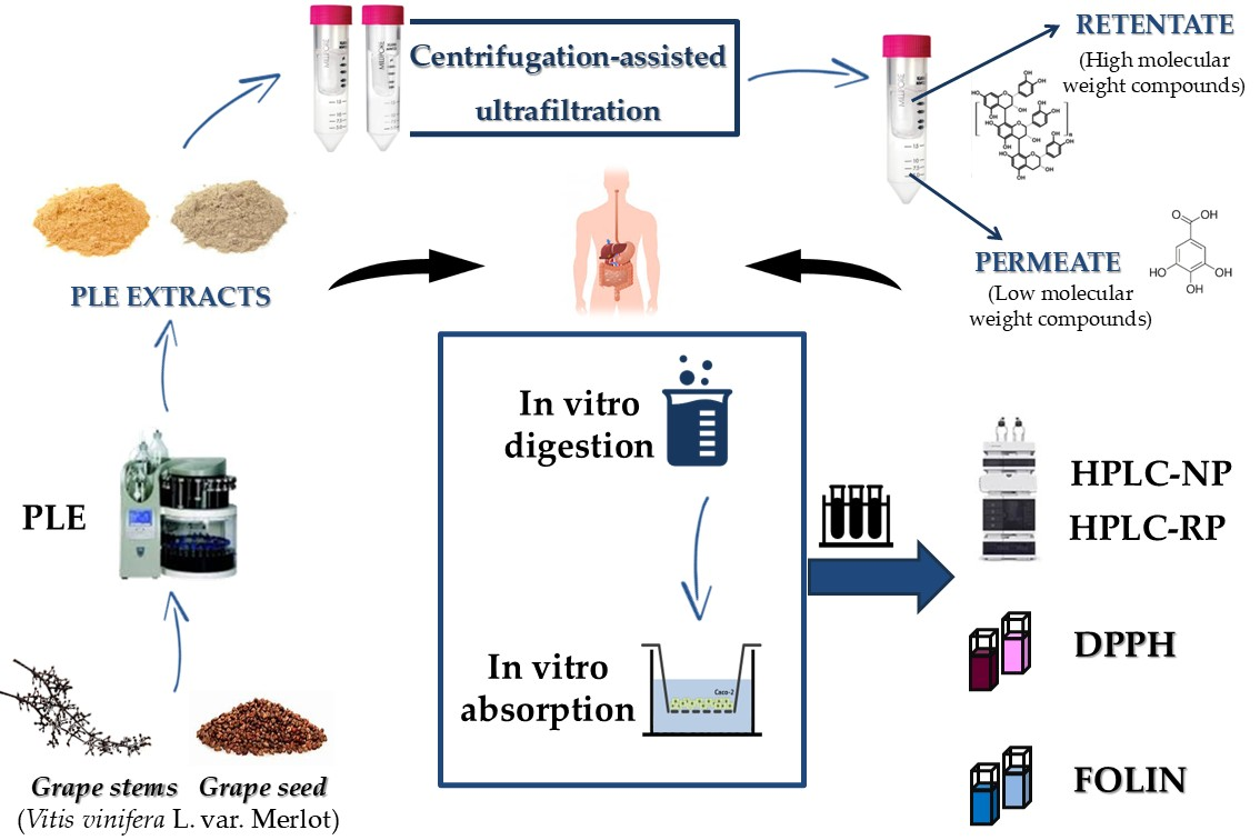 The aim of the present study was to evaluate the potential of centrifugation-assisted ultrafiltration process (CUF) as a low-molecular-weight phenolic compound purification and concentration process to enhance the bioaccessibility and bioavailability of phenolic extracts. To our knowledge, this process has not been used for this purpose before, being generally conducted by a conventional ultrafiltration process. The bioaccessibility and bioavailability of two pressurized liquid extracts (PLEs) obtained from grape stems and seeds were compared with those of their respective permeates obtained using the CUF process. Thus, total phenolic content, polymeric and individual low-molecular-weight phenolic composition, and antioxidant activity of the original PLE stem and seed extracts were monitored and compared during in vitro gastrointestinal digestion and in vitro intestinal absorption with their respective permeates.