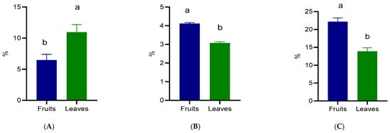 The proximate composition of the fruits and leaves is presented in Figure 2. Considerable differences were observed between the two plant parts. The protein content was significantly higher (p < 0.05) in the leaves (10.94%) compared with the fruits (6.46%) (Figure 2A). On the other hand, the fat content was significantly higher (p <0.05) in the fruits (4.11%) than in the leaves (3.07%) (Figure 2B). The fiber content also followed an opposite trend to protein, with fruits containing 22.16% and leaves 13.86% fiber (Figure 2C).