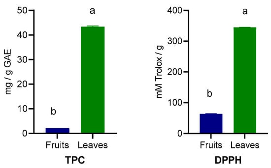 Total polyphenols content (TPC) and antioxidant capacity (DPPH) of wild Prunus spinosa stone fruits and leaves. Different letters (a,b) show significant differences at p < 0.05 according to ANOVA test; n = 3 represents 3 independent analyses, each performed with 3 analytical determinations.