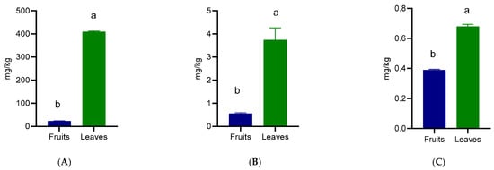 The mineral composition is summarized in Table 1. Significant differences were observed between both plant parts for the analyzed micronutrients (p < 0.05), except for copper concentrations, which were similar in both fruits and leaves (p = 0.0951). The most significant differences (p < 0.001) were observed in manganese and iron, which were 83.88% and 87.88% higher, respectively, in leaves compared with fruits. The zinc content was also higher in leaves than in fruits.
