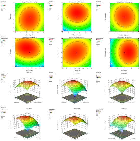 Contour plots and 3D plots of each interaction term. Note: Contour lines of elliptical shape indicate a significant interaction between two factors, while contour lines of circular shape indicate that there was no interaction [1]. The graphic color change from blue to red means that the encapsulation rate increased [1]. Faster color changes show a more significant effect of the factor on the encapsulation rate [1].