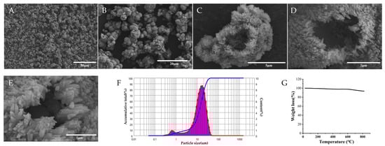 Figure 3A,B show that numerous HAP particles aggregated to form HAP clusters and these clusters distributed discretely. As shown in Figure 3C, the HAP particles exhibited an ellipsoidal morphology, and Figure 3D,E shows that the surface of HAP presented villous structures. In addition, each particle possessed a mass of tiny pores, and cavity structures existed in the particles. The results obtained with the LDPSA indicate that the particle sizes of the HAP particles ranged between 500 nm and 75 µm (Figure 3F) and the average particle size was 14.49 µm. The results of the mercury injection apparatus show that the total pore area of the HAP particles was 9.83 m2/g, the average pore diameter was 502.40 nm, the bulk density was 0.4415 g/mL, the apparent density was 0.9705 g/mL, and the porosity was 54.51%. The result of the TGA (Figure 3G) indicate that HAP possessed favorable thermal stability until 600 °C and it disintegrated when the temperature exceeded 600 °C.