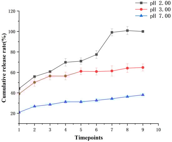 The results of the muffle furnace experiment indicated that the PsP content was 8.98% in PsP-HAP. Figure 4 shows the cumulative release rates of PsP-HAP at pH 2.00, 3.00, and 7.00. Within the 1.00st hour, they reached 44.22% (at pH 2.00), 39.05% (at pH 3.00), and 20.98% (at pH 7.00). Then, PsP-HAP’s cumulative release rates continuously increased before the 12.00th hour and tended to stability after that at the sustained-release condition of pH 2.00. At the sustained-release condition of pH 3.00, the cumulative release rates of PsP-HAP continuously increased before the 5.00th hour and tended to stability after that. However, the cumulative release rates of PsP-HAP only showed a small increase before the 2.00nd hour; it basically tended to stability after that at the sustained-release condition of pH 7.00. Finally, the cumulative release rates at pH 2.00, 3.00, and 7.00 reached 100.00%, 64.75%, and 38.00%, respectively, at the 48.00th hour. The above results indicate that PsP-HAP can have different sustained-release effects under different pH conditions. Therefore, it can be confirmed that PsP-HAP possesses a pH-responsive property, which can be used to realize controllable sustained-release effect to meet different physiological and health requirements.