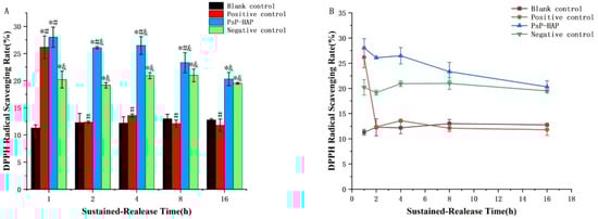 DPPH radical scavenging rate of PsP-HAP sustained-release system. Note: (A) Comparison of DPPH radical scavenging rate among different groups at each timepoint. (B) Comparison of DPPH radical scavenging rate among different timepoints in each group. *: The difference compared with the blank control group was statistically significant [11]. #: The difference compared with the negative control group was statistically significant [11]. &: The difference compared with the positive control group was statistically significant [11].