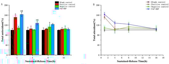 Total antioxidative capacity of PsP-HAP sustained-release system. Note: (A) Comparison of total antioxidative capacity among different groups at each timepoint. (B) Comparison of total antioxidative capacity among different timepoints in each group. *: The difference compared with the blank control group was statistically significant [11]. #: The difference compared with the negative control group was statistically significant [11].