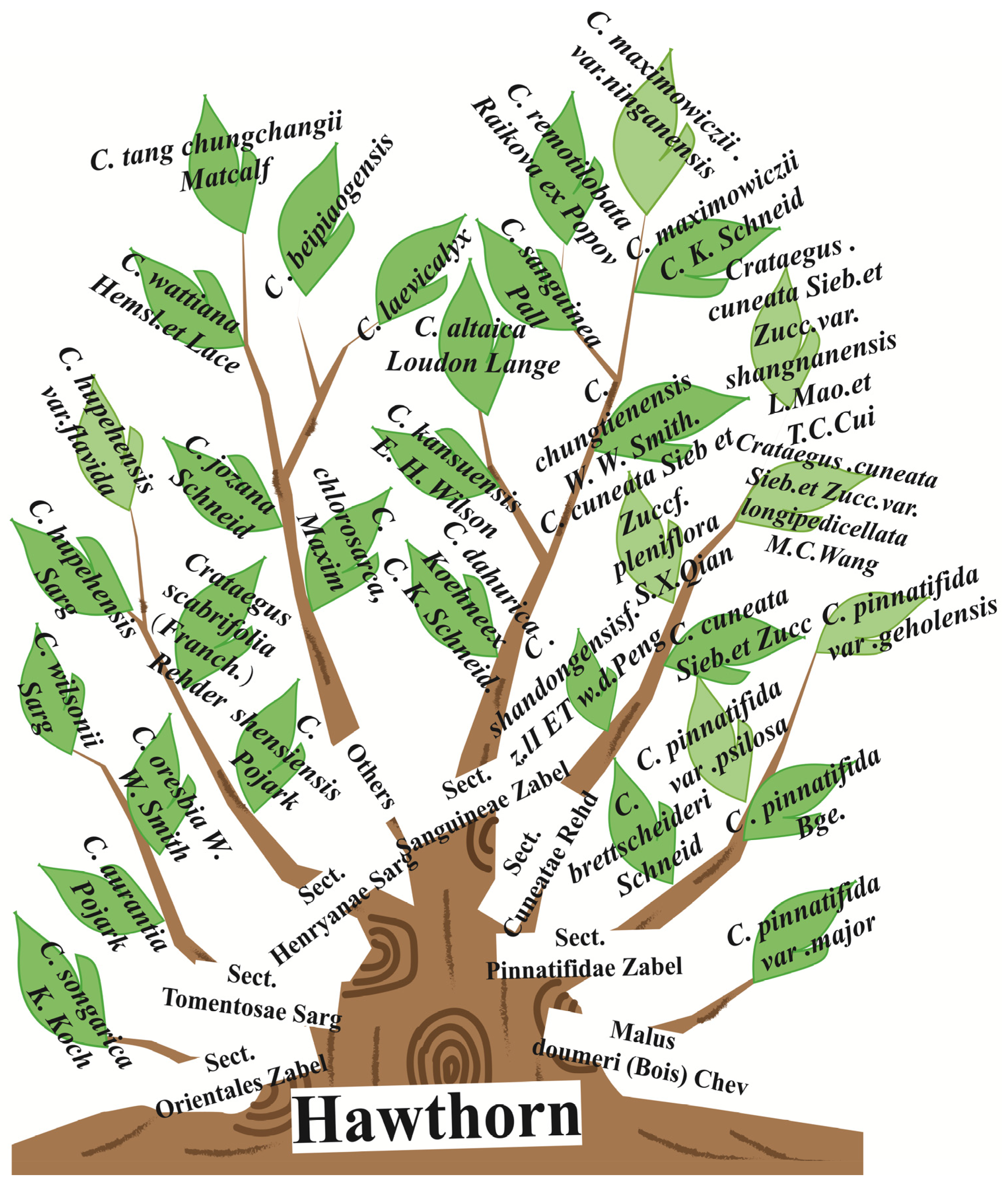 - Du, X.; Zhang, X.; Bu, H.; Zhang, T.; Lao, Y.; Dong, W. Molecular analysis of evolution and origins of cultivated Hawthorn (Crataegus spp.) and related species in China. Front. Plant Sci. 2019, 10, 443. [Google Scholar] [CrossRef] [PubMed]