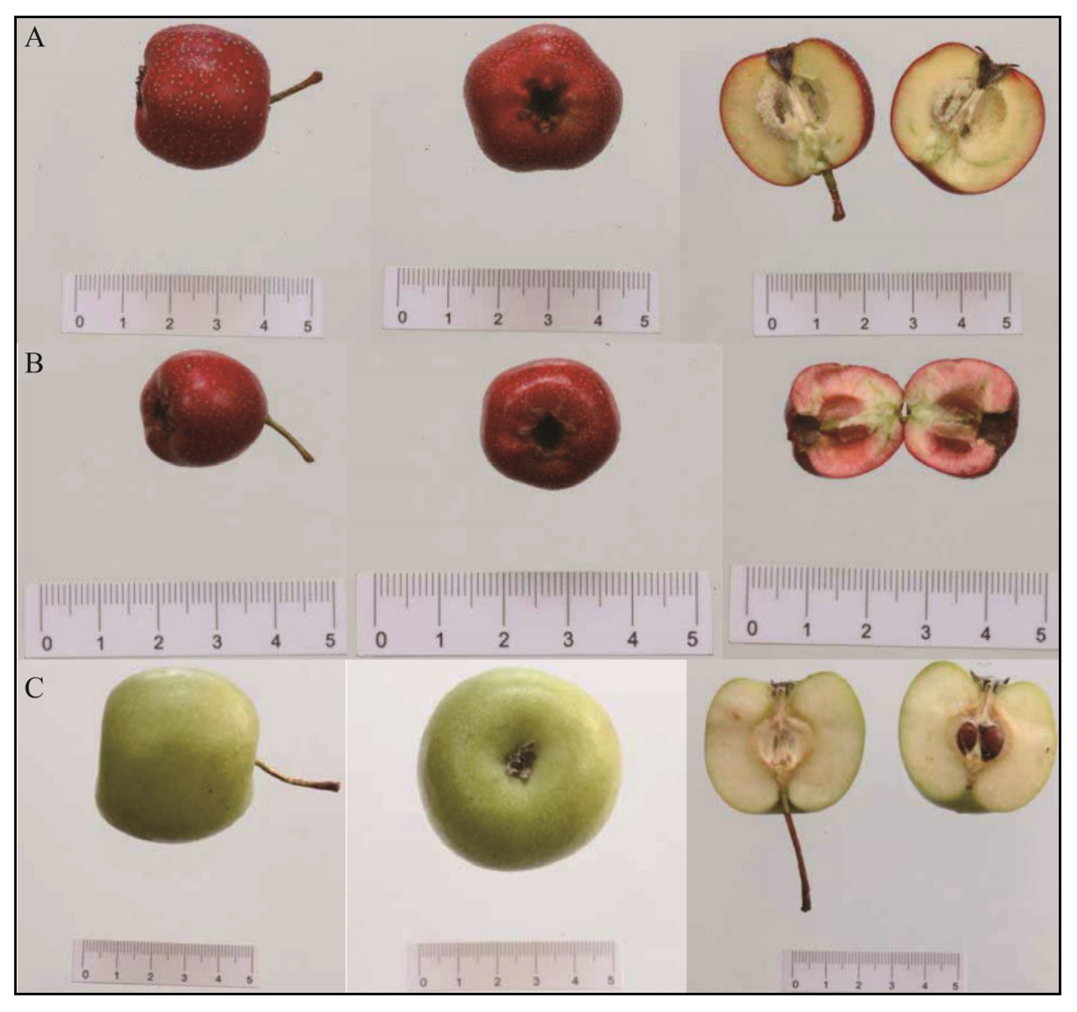 | Malus genus, Maloideae subfamily, Rosaceae family | Malus doumeri (Bois) Chev | C. pinnatifida var. major (Large-fruited hawthorn) | / | Widely distributed species | Guizhou, Jiangxi, Zhejiang, Hunan, Guangdong, Guangxi, Yunnan; Taiwan | Deciduous, sparsely semi-evergreen shrubs or small trees | The fruit is large (80–200 g each), with oblate or pear-spherical. The skin is light yellow with a light red hue on the sun-facing side. The top of the fruit is concave, and the stalk is medium-long. The flesh is yellowish-white, thick, and dense. The fruit has six to eight ventricles and three to six seeds. |