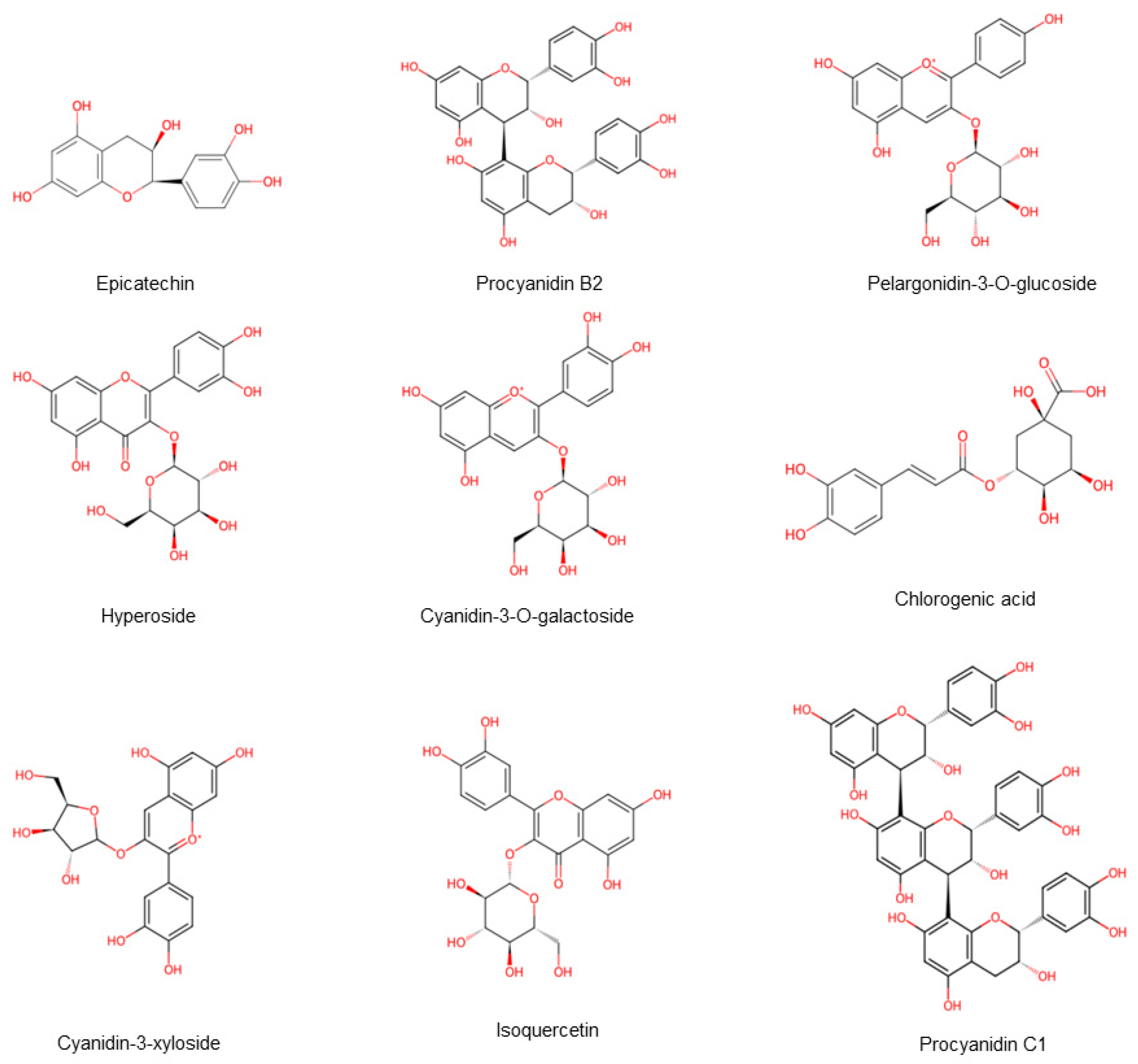 - Prasain, J.K.; Peng, N.; Dai, Y.; Moore, R.; Arabshahi, A.; Wilson, L.; Barnes, S.; Michael Wyss, J.; Kim, H.; Watts, R.L. Liquid chromatography tandem mass spectrometry identification of proanthocyanidins in rat plasma after oral administration of grape seed extract. Phytomedicine 2009, 16, 233–243. [Google Scholar] [CrossRef] [PubMed]