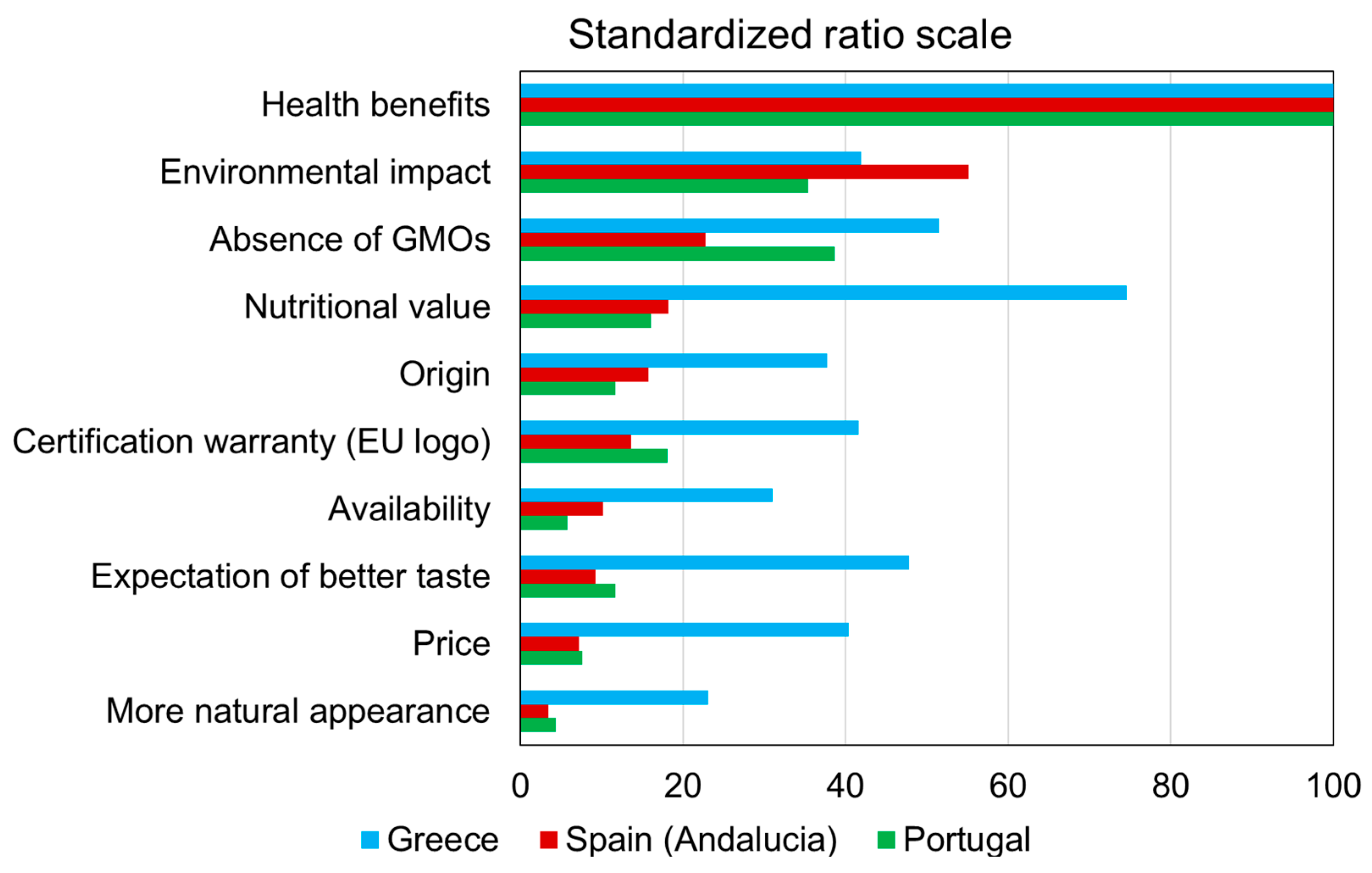 74]. Also, because men may be more price-sensitive or oriented to convenience and status cues in some contexts, strategies that emphasise value (promotions, bundle offers) and convenience (availability in mainstream retail, ready-to-eat formats) can broaden male uptake. Finally, in terms of national tailoring matters, Greece’s stronger role of appearance/nutrition suggests that sensory and culinary messaging (taste, traditional recipes using organic ingredients) could be relatively more effective there, whereas Portugal and Spain may respond better to campaigns emphasising certification, provenance and environmental credentials [