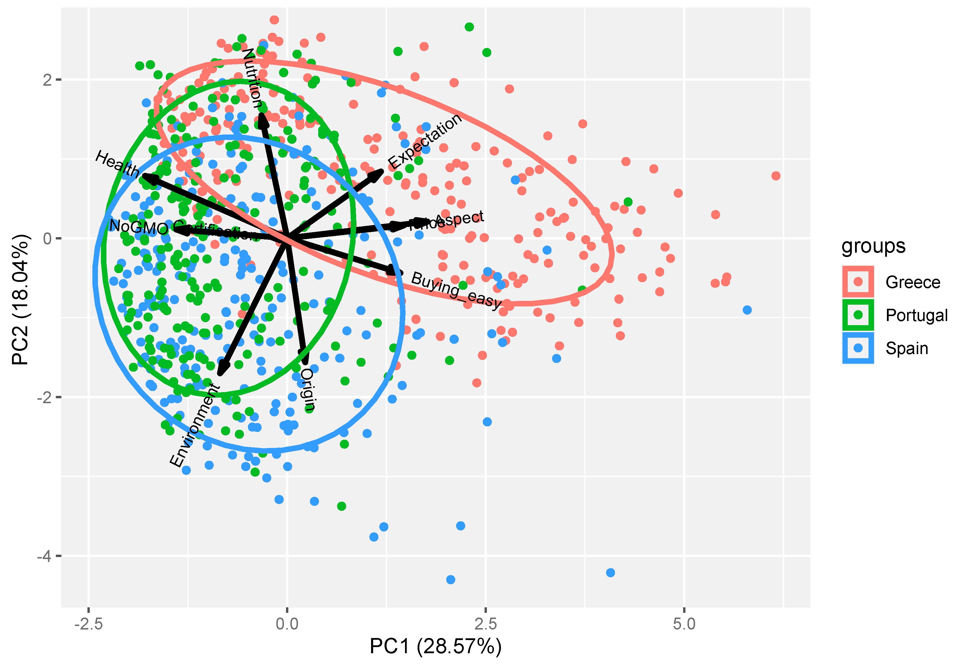 Conversely, Greek consumers attach lower levels of importance to Environment and NoGMO. Portuguese and Spanish consumers, in contrast to Greeks, assign lower importance to Price and Aspect. Compared with both Greeks and Spaniards, Portuguese consumers place less importance on Buying Easy, while Spanish consumers show lower levels of importance for Expectation relative to the other two countries.