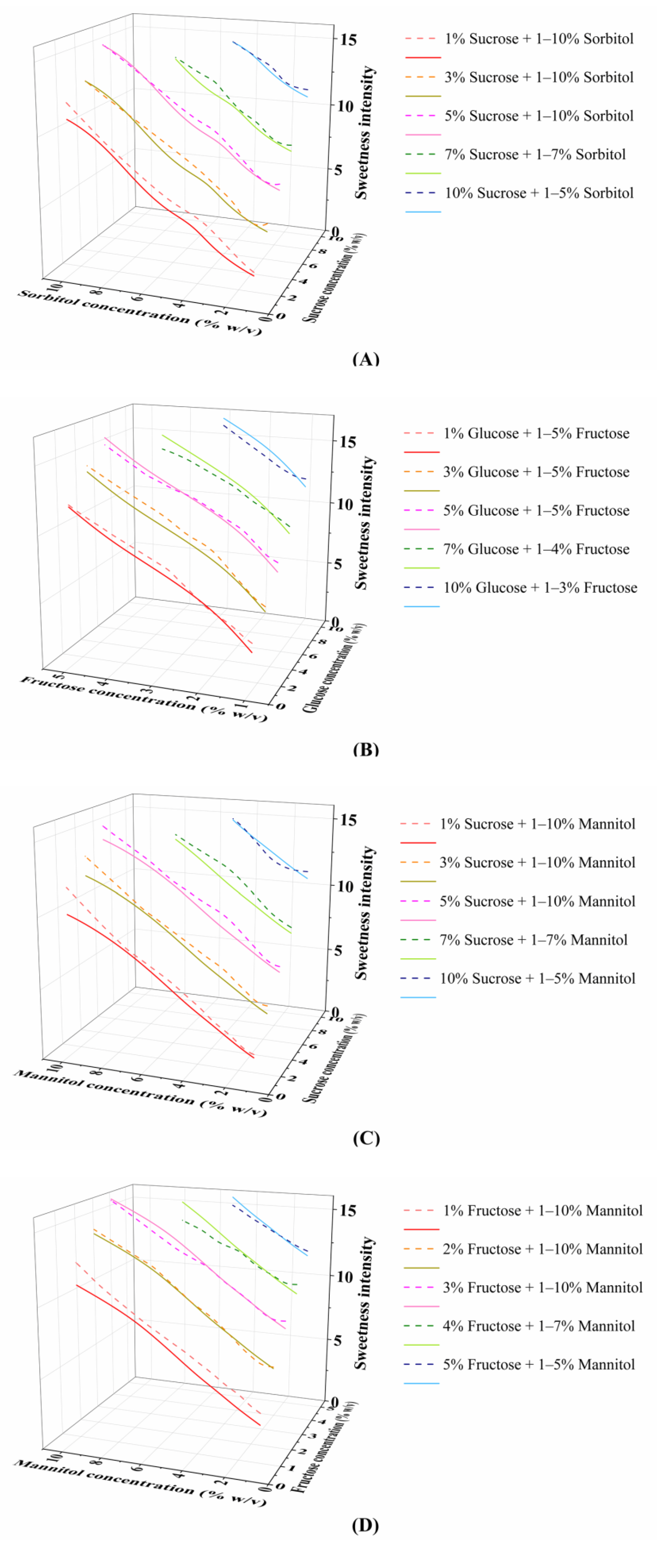 3.4. Analysis of Concentration–Sweetness Intensity Curves for Ternary Sweeteners