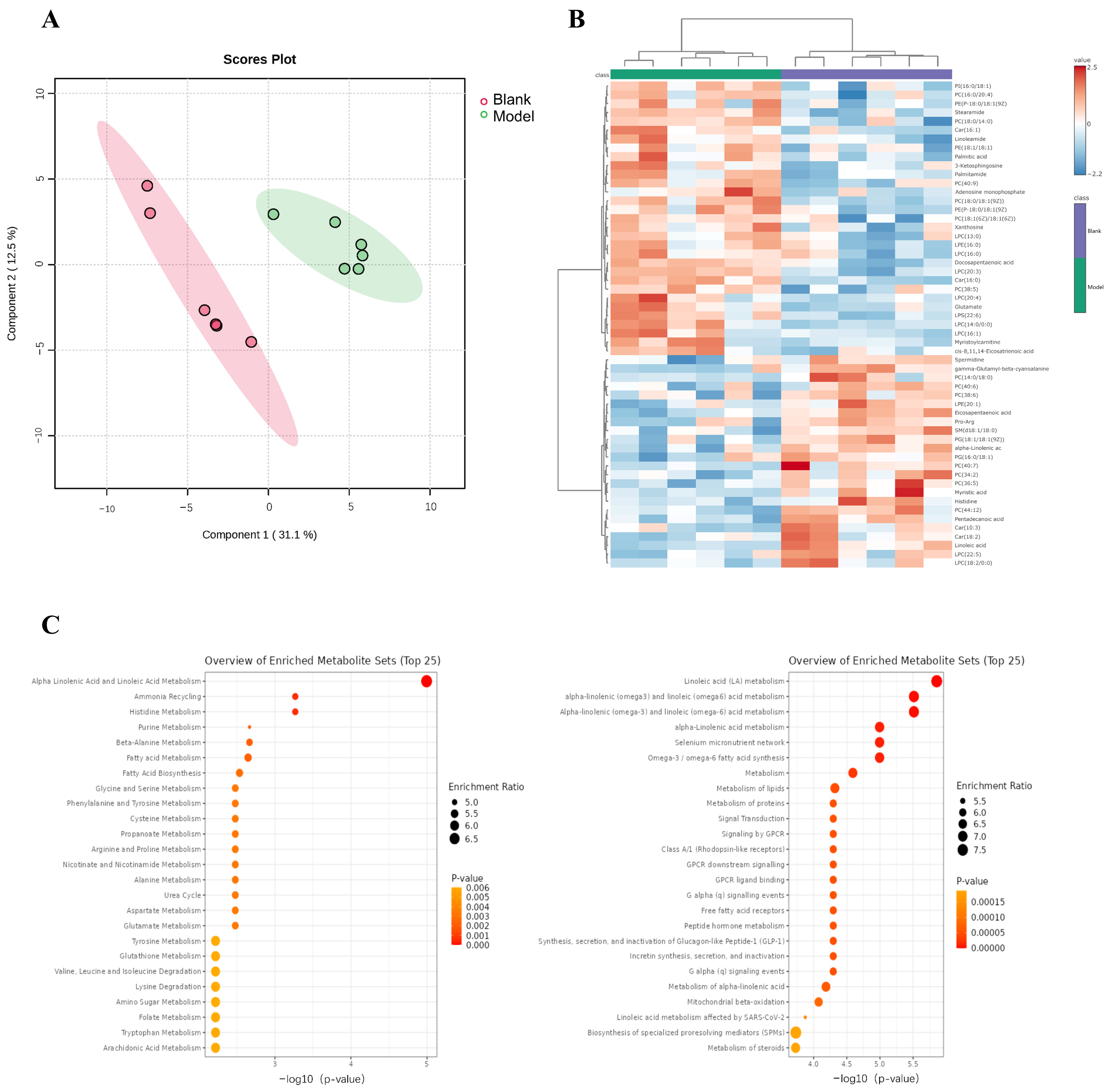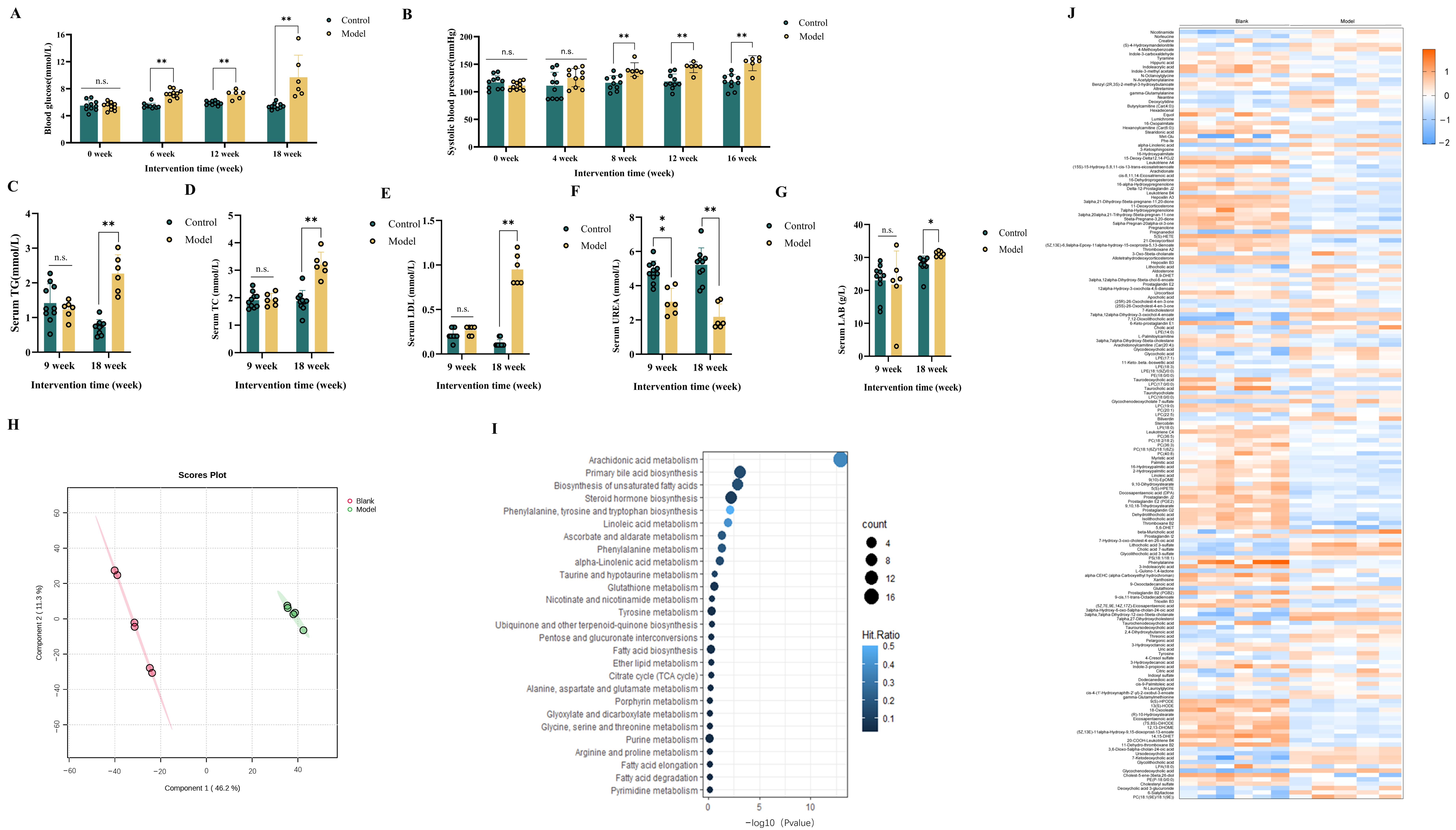 3.1. Effects of HSHFHFD on Blood Glucose, Systolic Blood Pressure, and Serum Biochemical Indices and Metabolomics in Rats