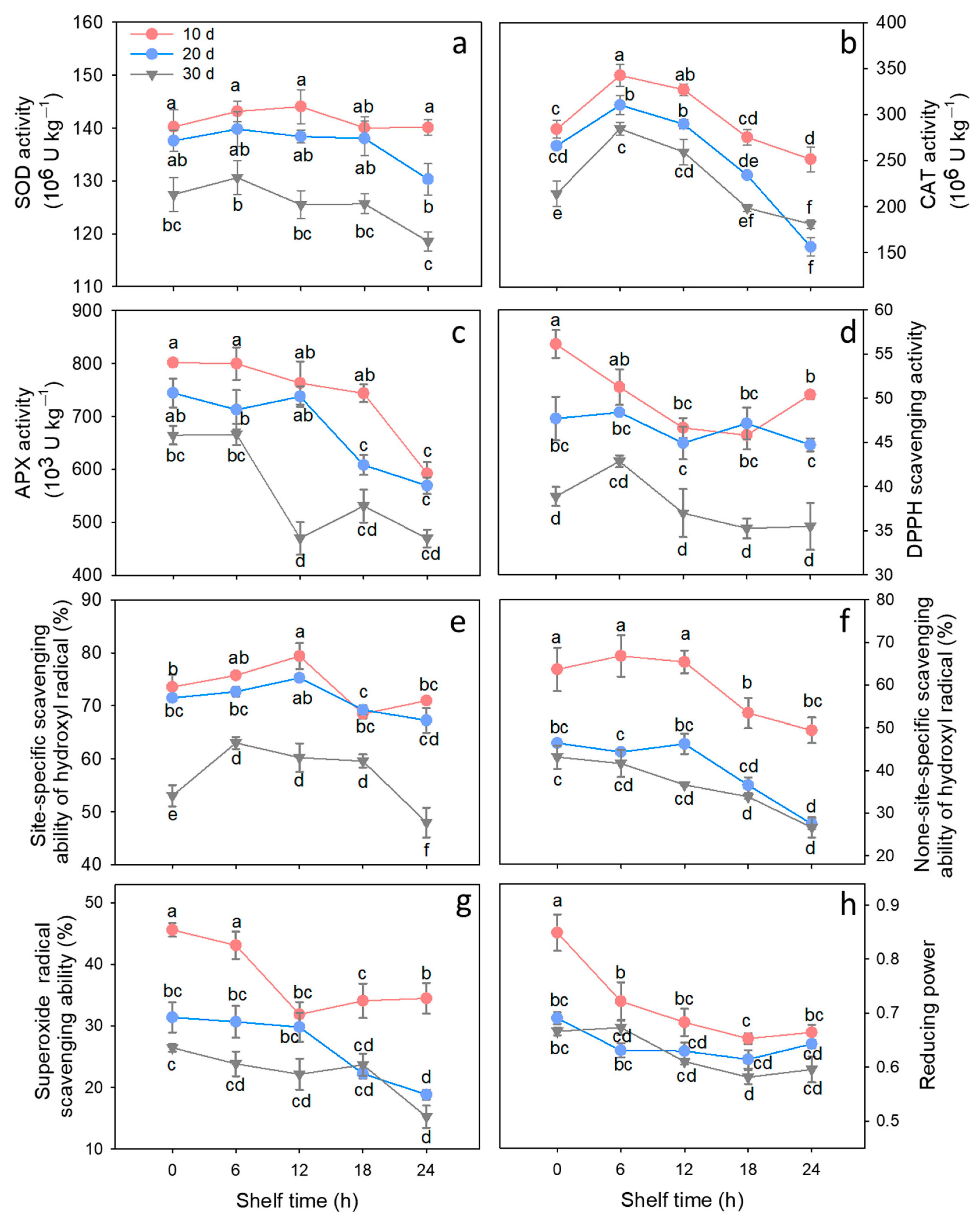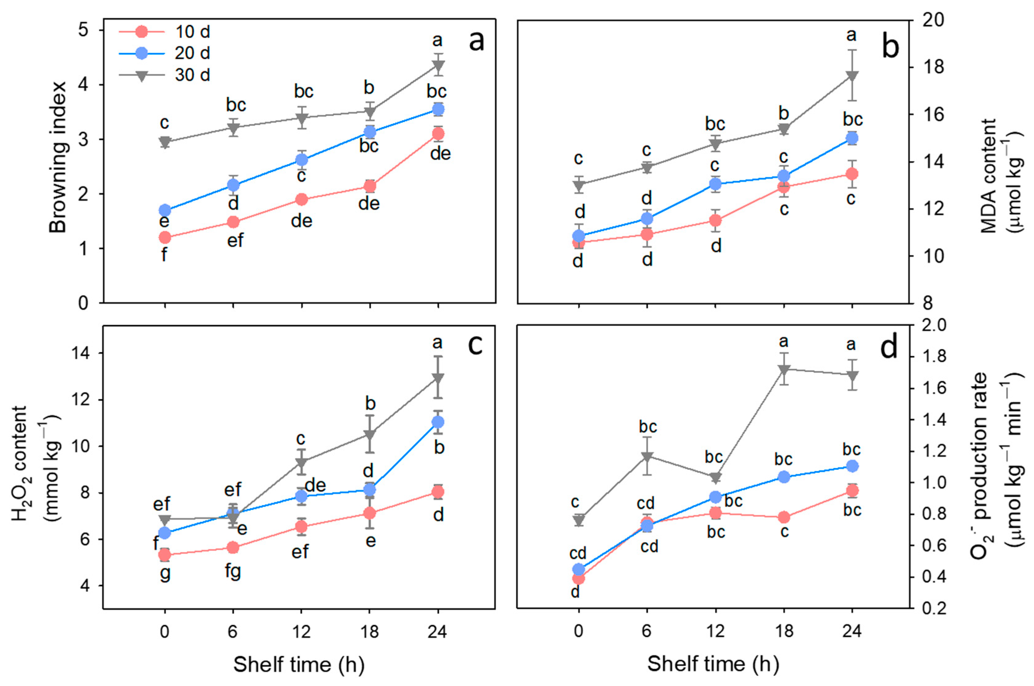 - Liu, H.; Song, L.; You, Y.; Li, Y.; Duan, X.; Jiang, Y.; Joyce, D.C.; Ashraf, M.; Lu, W. Cold storage duration affects litchi fruit quality, membrane permeability, enzyme activities and energy charge during shelf time at ambient temperature. Postharvest Biol. Technol. 2011, 60, 24–30. [Google Scholar] [CrossRef]