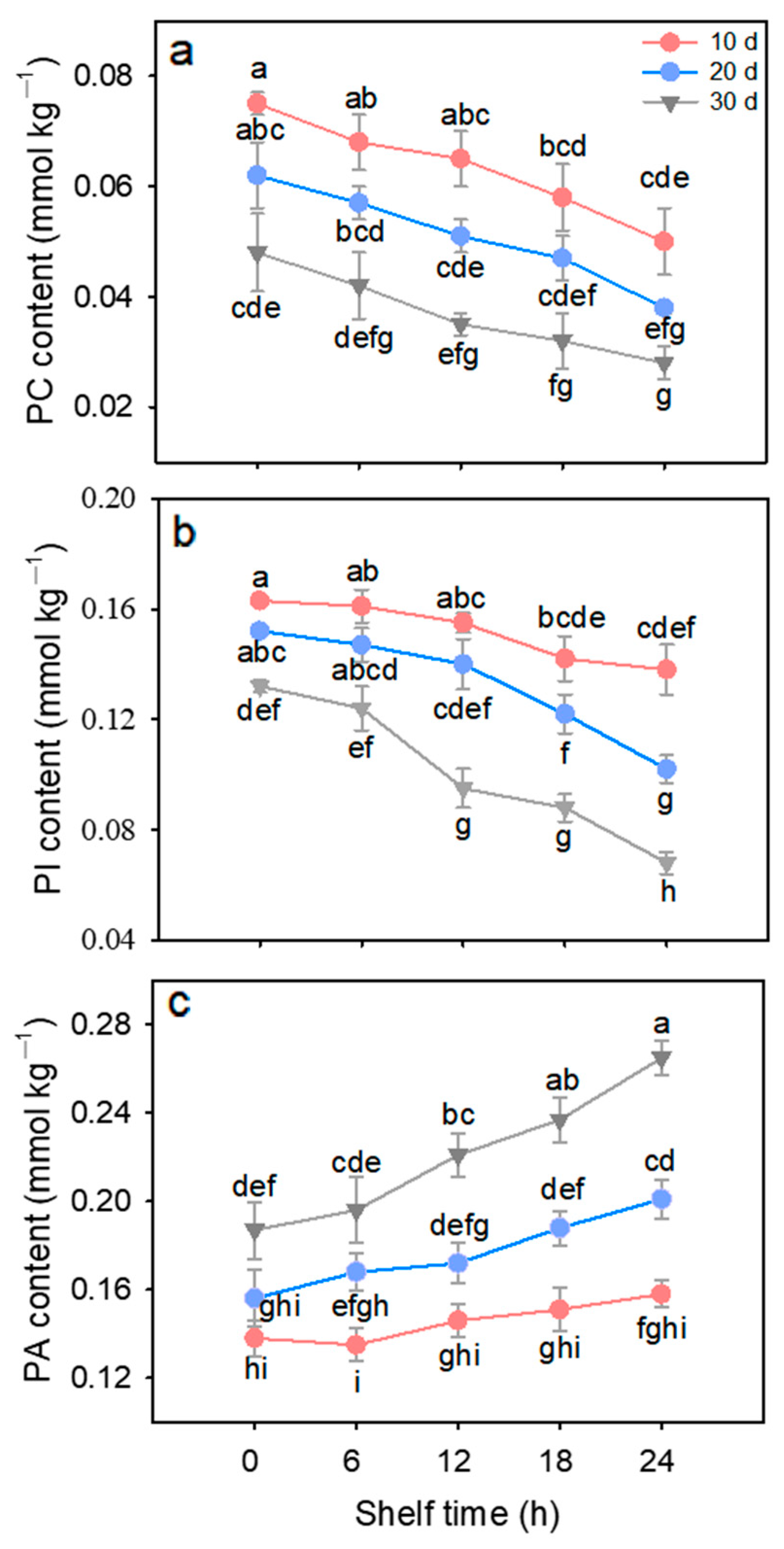 2.7. Determination of Phosphatidylcholine (PC), Phosphatidylinositol (PI), and Phosphatidic Acid (PA) Content