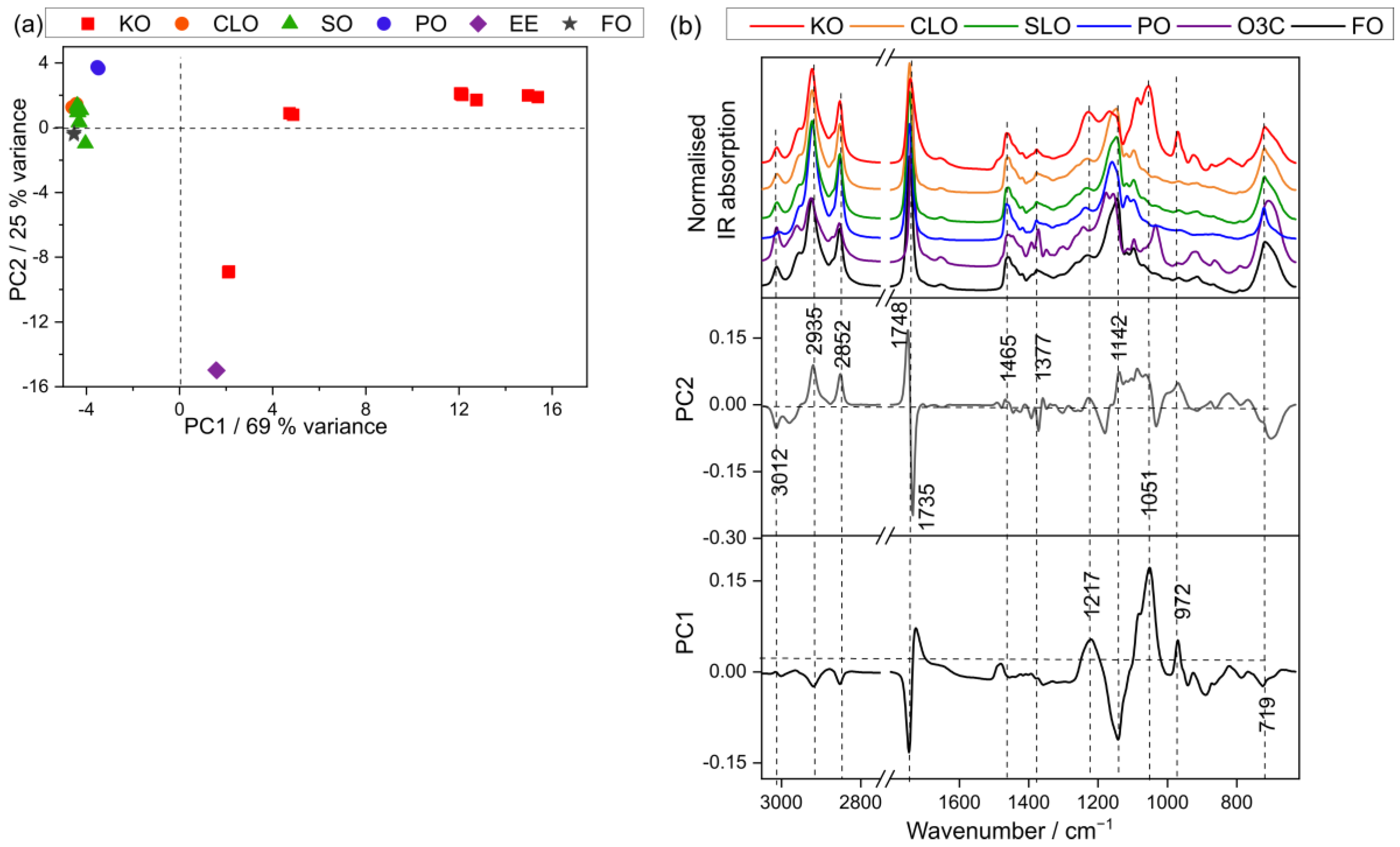 - Guillen, M.D.; Cabo, N. Characterization of edible oils and lard by Fourier transform infrared spectroscopy. Relationships between composition and frequency of concrete bands in the fingerprint region. J. Am. Oil Chem. Soc. 1997, 74, 1281–1286. [Google Scholar] [CrossRef]