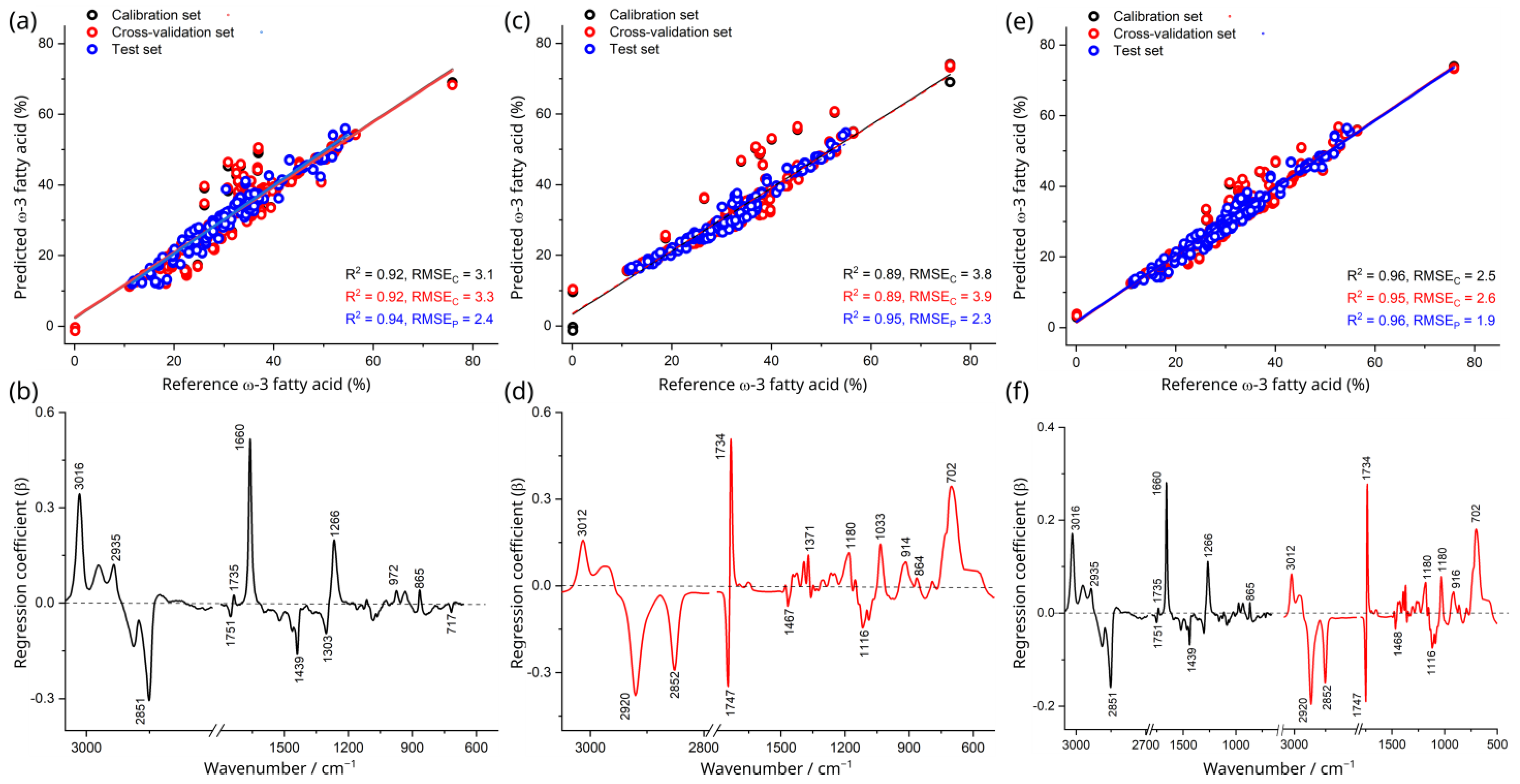 | Total ω-3% (model range: 0 to 100%) | Raman | 2 | 0.92 | 3.1% | 0.92 | 3.3% | 0.94 | 0.97 | 1.1 | 2.4% |