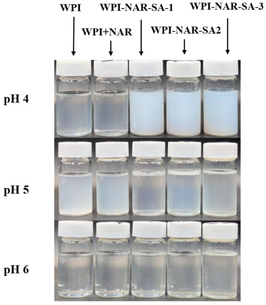 Appearance of WPI, WPI-NAR, and WPI-NAR-SA complexes at different pH values.