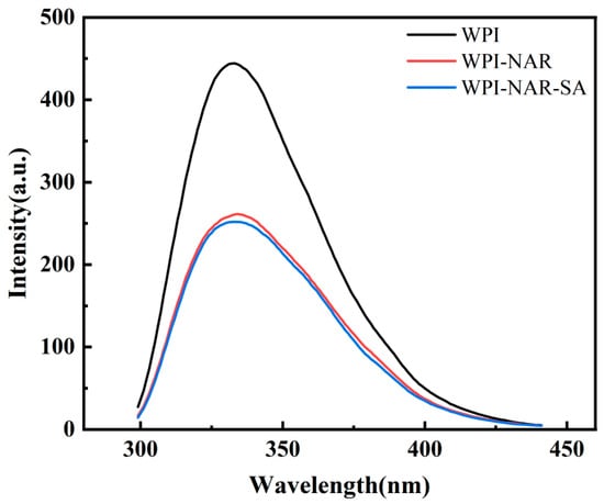 Fluorescence spectra of WPI, WPI-NAR, and WPI-NAR-SA measured at pH 5.0.