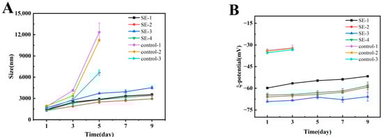 The stability of emulsions was influenced by a combination of factors, among which droplet size and ζ-potential were recognized as two critical parameters. Emulsions with smaller droplet sizes generally demonstrated higher stability, as smaller oil droplets could be distributed more uniformly within the continuous phase, exhibiting more intense Brownian motion which consequently reduced the tendency for droplet aggregation [24]. The particle sizes of the emulsion samples were displayed in Figure 3A. Phase separation was observed in the control group upon storage to day 3, and the mean droplet size was found to continuously increase, which was indicative of its poor physical stability. In contrast, a slower rate of droplet size increase was recorded in all composite emulsion systems with prolonged storage time. Among all composite emulsions, SE-3 was characterized by the largest droplet size. This phenomenon could be attributed to the higher SA concentration, which tended to form larger electrostatic complexes with whey protein, ultimately resulting in larger droplet sizes. The larger droplet size of SE-1 compared to SE-2 suggested that the lower SA concentration was insufficient to form a stable composite interfacial film with whey protein, leading to increased droplet aggregation and ultimately the formation of larger droplets. Through comparison between SE-2 and SE-4, it was observed that the incorporation of NAR led to a further reduction in droplet size. This effect could be attributed to its ability to induce conformational changes in proteins or enhance interfacial repulsive forces, thereby promoting a more compact arrangement of the adsorption layer and effectively suppressing droplet aggregation.