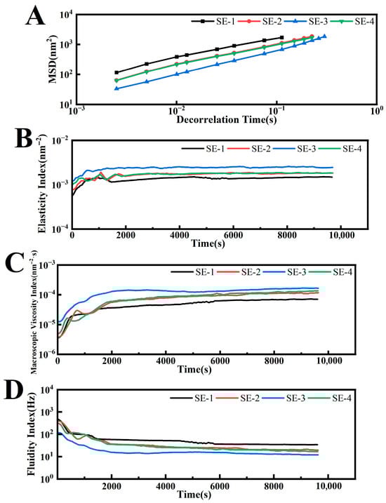 Compared with traditional mechanical rheological testing, optical microrheology enables in situ measurements of static samples without altering their shape, allowing real-time monitoring of the specimen. It has now emerged as an important technique in rheological research [28]. This method analyzes the backscattered speckle images of laser light of a given wavelength passing through the sample to obtain the motion of dispersed particles, that is, the relationship between the mean square displacement (MSD) and the decorrelation time (t), thereby characterizing the microscopic rheological properties of the dispersion. The microrheological parameters of each emulsion group at the endpoint are summarized in Table 3. The solid–liquid balance (SLB) index was calculated from the slope of the MSD curve plateau, where a steeper slope corresponded to a higher SLB index, indicating more pronounced liquid-like characteristics of particles in the system. All samples exhibited SLB values exceeding 0.5, confirming their liquid state. As shown in Figure 5A, comparison among SE-1 to SE-3 revealed that SE-3 displayed the lowest MSD values within the decorrelation time, demonstrating that increased SA concentration contributed to enhanced viscoelastic properties of the emulsion.