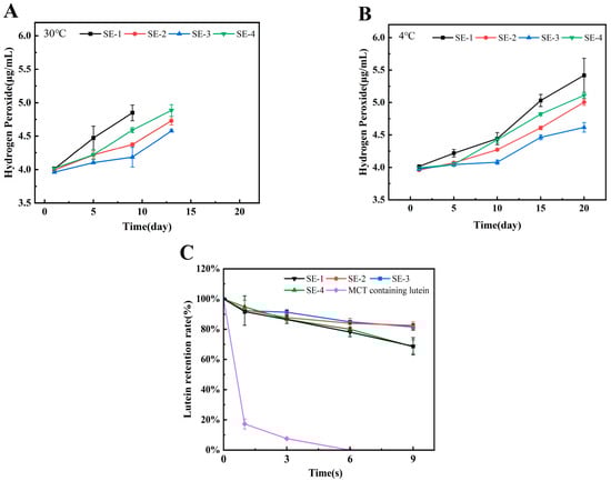 The oxidative stability ((A) at 30 °C; (B) at 4 °C) and lutein retention capacity (C) of the emulsion samples. Note: Monitoring was terminated when visible physical separation occurred, as samples extracted after this point could no longer represent the homogeneous oxidative state of the entire emulsion system. Consequently, the data collection ended at day 13 for samples stored at 30 °C and at day 20 for samples stored at 4 °C.